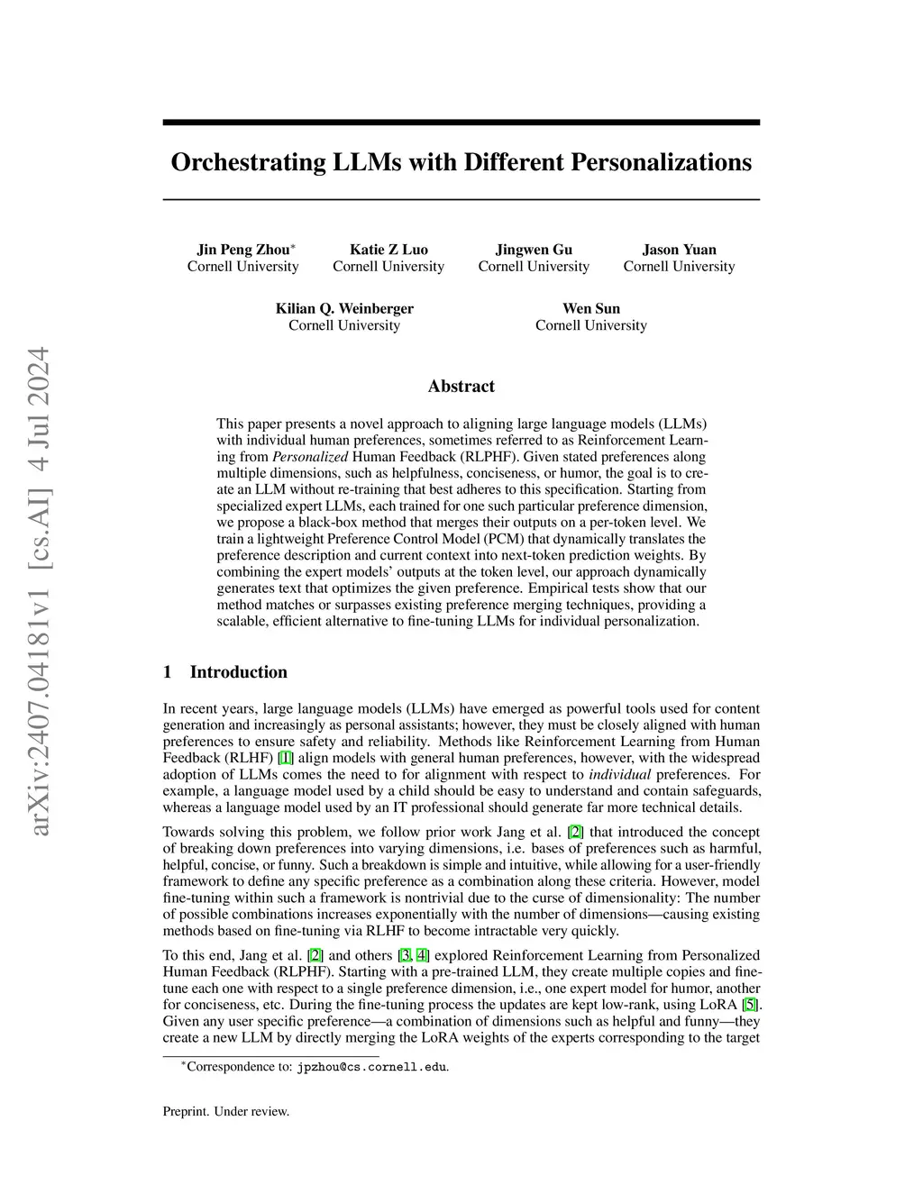 This paper presents a novel approach to aligning large language models (LLMs) with individual human preferences, sometimes referred to as Reinforcement Learning from \textit{Personalized} Human Feedback (RLPHF). Given stated preferences along multiple dimensions, such as helpfulness, conciseness, or humor, the goal is to create an LLM without re-training that best adheres to this specification. Starting from specialized expert LLMs, each trained for one such particular preference dimension, we propose a black-box method that merges their outputs on a per-token level. We train a lightweight Preference Control Model (PCM) that dynamically translates the preference description and current context into next-token prediction weights. By combining the expert models' outputs at the token level, our approach dynamically generates text that optimizes the given preference. Empirical tests show that our method matches or surpasses existing preference merging techniques, providing a scalable, efficient alternative to fine-tuning LLMs for individual personalization.