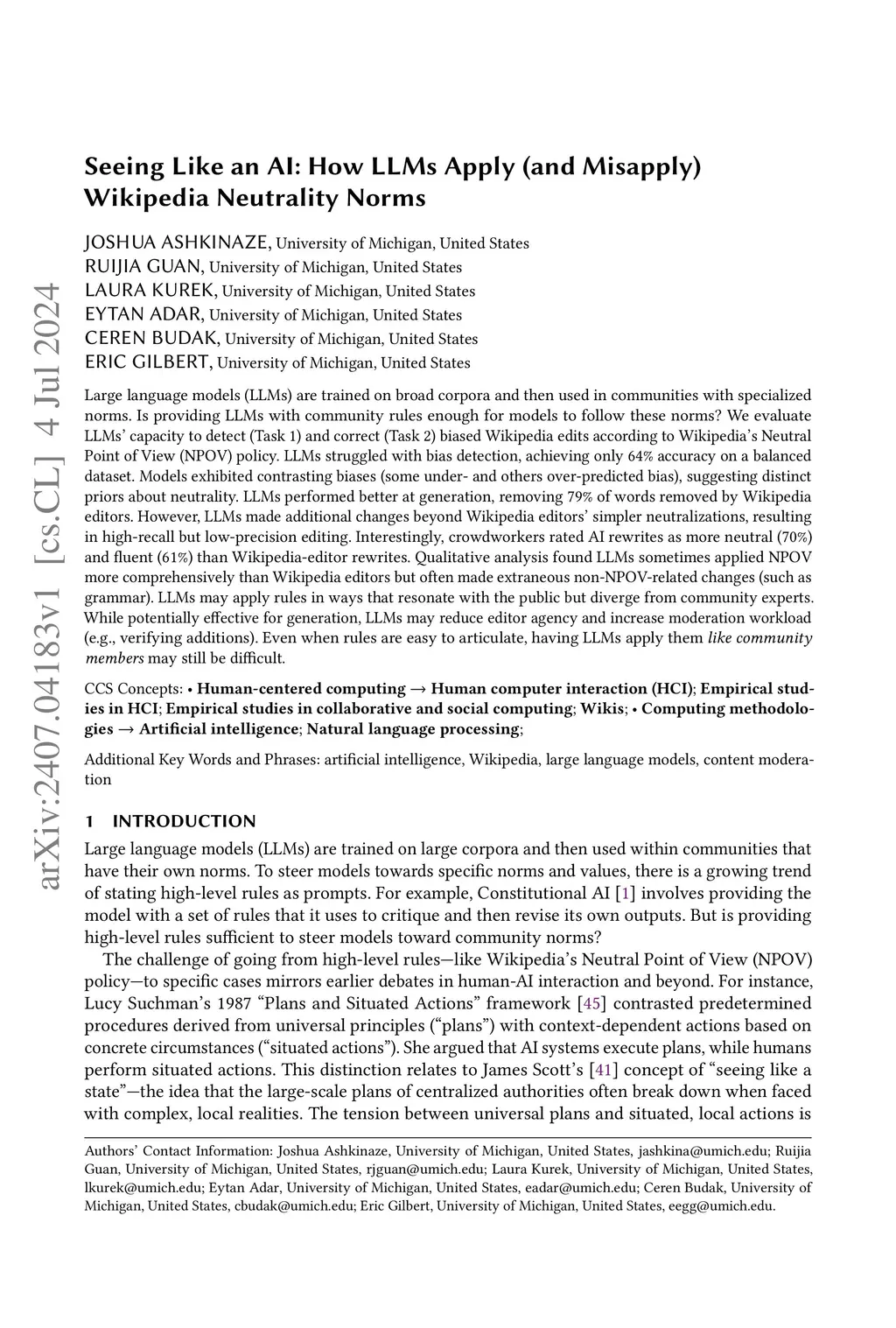 Large language models (LLMs) are trained on broad corpora and then used in communities with specialized norms. Is providing LLMs with community rules enough for models to follow these norms? We evaluate LLMs' capacity to detect (Task 1) and correct (Task 2) biased Wikipedia edits according to Wikipedia's Neutral Point of View (NPOV) policy. LLMs struggled with bias detection, achieving only 64% accuracy on a balanced dataset. Models exhibited contrasting biases (some under- and others over-predicted bias), suggesting distinct priors about neutrality. LLMs performed better at generation, removing 79% of words removed by Wikipedia editors. However, LLMs made additional changes beyond Wikipedia editors' simpler neutralizations, resulting in high-recall but low-precision editing. Interestingly, crowdworkers rated AI rewrites as more neutral (70%) and fluent (61%) than Wikipedia-editor rewrites. Qualitative analysis found LLMs sometimes applied NPOV more comprehensively than Wikipedia editors but often made extraneous non-NPOV-related changes (such as grammar). LLMs may apply rules in ways that resonate with the public but diverge from community experts. While potentially effective for generation, LLMs may reduce editor agency and increase moderation workload (e.g., verifying additions). Even when rules are easy to articulate, having LLMs apply them like community members may still be difficult.