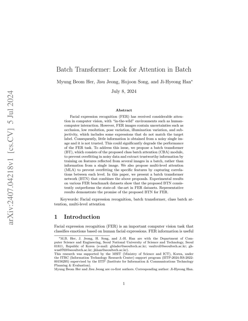Facial expression recognition (FER) has received considerable attention in computer vision, with "in-the-wild" environments such as human-computer interaction. However, FER images contain uncertainties such as occlusion, low resolution, pose variation, illumination variation, and subjectivity, which includes some expressions that do not match the target label. Consequently, little information is obtained from a noisy single image and it is not trusted. This could significantly degrade the performance of the FER task. To address this issue, we propose a batch transformer (BT), which consists of the proposed class batch attention (CBA) module, to prevent overfitting in noisy data and extract trustworthy information by training on features reflected from several images in a batch, rather than information from a single image. We also propose multi-level attention (MLA) to prevent overfitting the specific features by capturing correlations between each level. In this paper, we present a batch transformer network (BTN) that combines the above proposals. Experimental results on various FER benchmark datasets show that the proposed BTN consistently outperforms the state-ofthe-art in FER datasets. Representative results demonstrate the promise of the proposed BTN for FER.