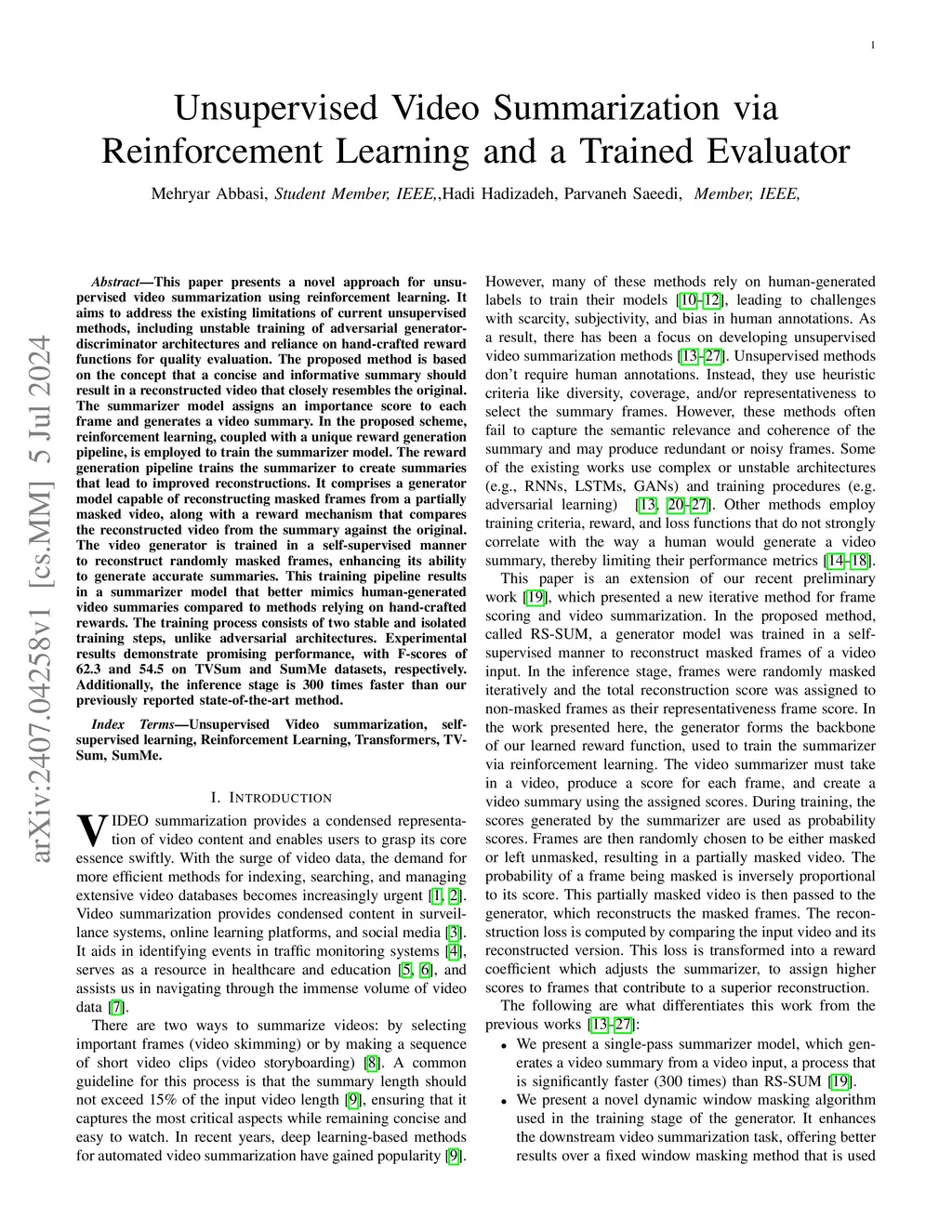 This paper presents a novel approach for unsupervised video summarization using reinforcement learning (RL), addressing limitations like unstable adversarial training and reliance on heuristic-based reward functions. The method operates on the principle that reconstruction fidelity serves as a proxy for informativeness, correlating summary quality with reconstruction ability. The summarizer model assigns importance scores to frames to generate the final summary. For training, RL is coupled with a unique reward generation pipeline that incentivizes improved reconstructions. This pipeline uses a generator model to reconstruct the full video from the selected summary frames; the similarity between the original and reconstructed video provides the reward signal. The generator itself is pre-trained self-supervisedly to reconstruct randomly masked frames. This two-stage training process enhances stability compared to adversarial architectures. Experimental results show strong alignment with human judgments and promising F-scores, validating the reconstruction objective.