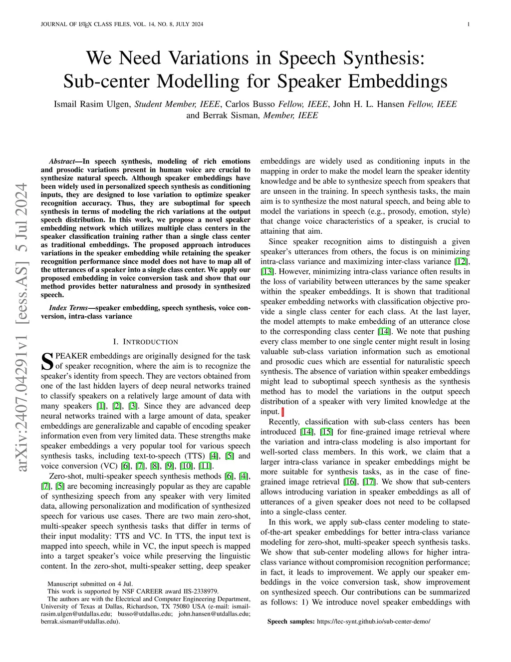 Modeling the rich prosodic variations inherent in human speech is essential for generating natural-sounding speech. While speaker embeddings are commonly used as conditioning inputs in personalized speech generation, they are typically optimized for speaker recognition, which encourages the loss of intra-speaker variation. This strategy makes them suboptimal for speech generation in terms of modeling the rich variations at the output speech distribution. In this work, we propose a novel speaker embedding network that employs multiple sub-centers per speaker class during training, instead of a single center as in conventional approaches. This sub-center modeling allows the embedding to capture a broader range of speaker-specific variations while maintaining speaker classification performance. We demonstrate the effectiveness of the proposed embeddings on a voice conversion task, showing improved naturalness and prosodic expressiveness in the synthesized speech.