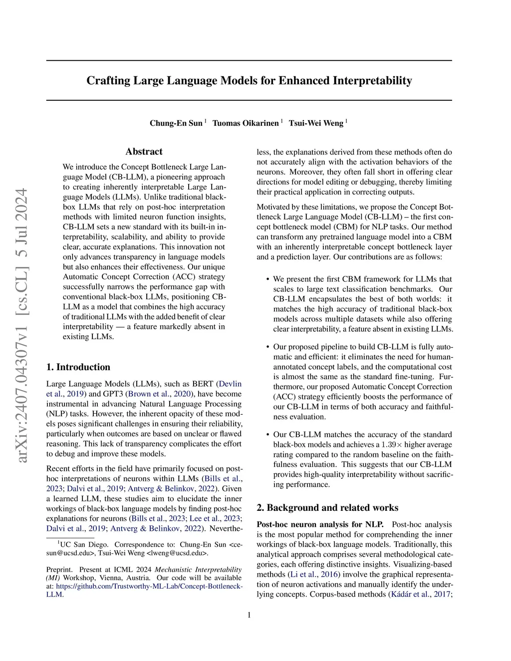 We introduce the Concept Bottleneck Large Language Model (CB-LLM), a pioneering approach to creating inherently interpretable Large Language Models (LLMs). Unlike traditional black-box LLMs that rely on post-hoc interpretation methods with limited neuron function insights, CB-LLM sets a new standard with its built-in interpretability, scalability, and ability to provide clear, accurate explanations. This innovation not only advances transparency in language models but also enhances their effectiveness. Our unique Automatic Concept Correction (ACC) strategy successfully narrows the performance gap with conventional black-box LLMs, positioning CB-LLM as a model that combines the high accuracy of traditional LLMs with the added benefit of clear interpretability -- a feature markedly absent in existing LLMs.