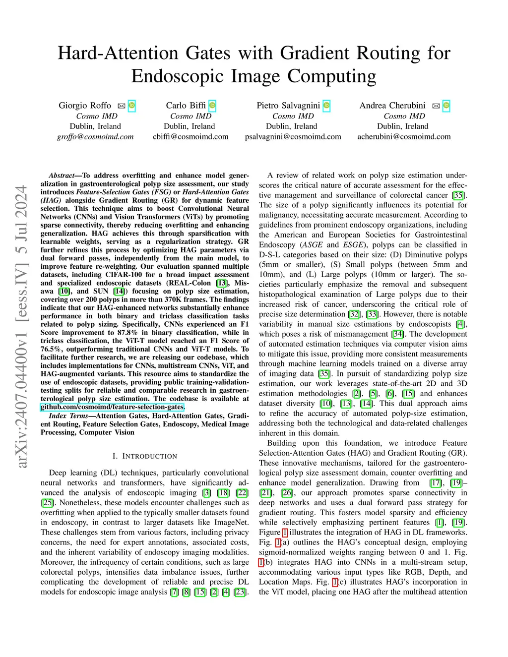 To address overfitting and enhance model generalization in gastroenterological polyp size assessment, our study introduces Feature-Selection Gates (FSG) or Hard-Attention Gates (HAG) alongside Gradient Routing (GR) for dynamic feature selection. This technique aims to boost Convolutional Neural Networks (CNNs) and Vision Transformers (ViTs) by promoting sparse connectivity, thereby reducing overfitting and enhancing generalization. HAG achieves this through sparsification with learnable weights, serving as a regularization strategy. GR further refines this process by optimizing HAG parameters via dual forward passes, independently from the main model, to improve feature re-weighting. Our evaluation spanned multiple datasets, including CIFAR-100 for a broad impact assessment and specialized endoscopic datasets (REAL-Colon, Misawa, and SUN) focusing on polyp size estimation, covering over 200 polyps in more than 370,000 frames. The findings indicate that our HAG-enhanced networks substantially enhance performance in both binary and triclass classification tasks related to polyp sizing. Specifically, CNNs experienced an F1 Score improvement to 87.8% in binary classification, while in triclass classification, the ViT-T model reached an F1 Score of 76.5%, outperforming traditional CNNs and ViT-T models. To facilitate further research, we are releasing our codebase, which includes implementations for CNNs, multistream CNNs, ViT, and HAG-augmented variants. This resource aims to standardize the use of endoscopic datasets, providing public training-validation-testing splits for reliable and comparable research in gastroenterological polyp size estimation. The codebase is available at github.com/cosmoimd/feature-selection-gates.