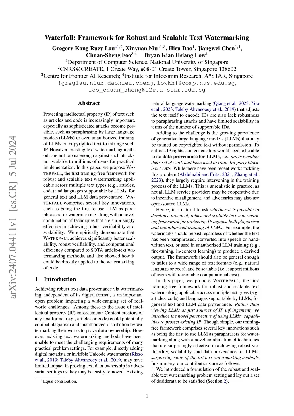 Protecting intellectual property (IP) of text such as articles and code is increasingly important, especially as sophisticated attacks become possible, such as paraphrasing by large language models (LLMs) or even unauthorized training of LLMs on copyrighted text to infringe such IP. However, existing text watermarking methods are not robust enough against such attacks nor scalable to millions of users for practical implementation. In this paper, we propose Waterfall, the first training-free framework for robust and scalable text watermarking applicable across multiple text types (e.g., articles, code) and languages supportable by LLMs, for general text and LLM data provenance. Waterfall comprises several key innovations, such as being the first to use LLM as paraphrasers for watermarking along with a novel combination of techniques that are surprisingly effective in achieving robust verifiability and scalability. We empirically demonstrate that Waterfall achieves significantly better scalability, robust verifiability, and computational efficiency compared to SOTA article-text watermarking methods, and also showed how it could be directly applied to the watermarking of code.