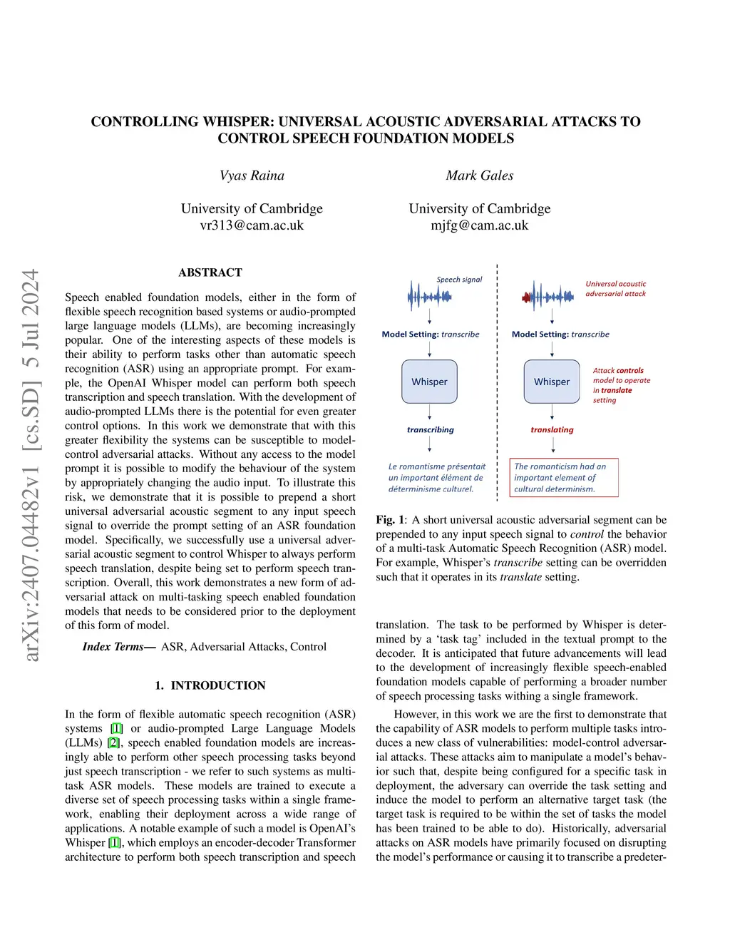 Speech enabled foundation models, either in the form of flexible speech recognition based systems or audio-prompted large language models (LLMs), are becoming increasingly popular. One of the interesting aspects of these models is their ability to perform tasks other than automatic speech recognition (ASR) using an appropriate prompt. For example, the OpenAI Whisper model can perform both speech transcription and speech translation. With the development of audio-prompted LLMs there is the potential for even greater control options. In this work we demonstrate that with this greater flexibility the systems can be susceptible to model-control adversarial attacks. Without any access to the model prompt it is possible to modify the behaviour of the system by appropriately changing the audio input. To illustrate this risk, we demonstrate that it is possible to prepend a short universal adversarial acoustic segment to any input speech signal to override the prompt setting of an ASR foundation model. Specifically, we successfully use a universal adversarial acoustic segment to control Whisper to always perform speech translation, despite being set to perform speech transcription. Overall, this work demonstrates a new form of adversarial attack on multi-tasking speech enabled foundation models that needs to be considered prior to the deployment of this form of model.