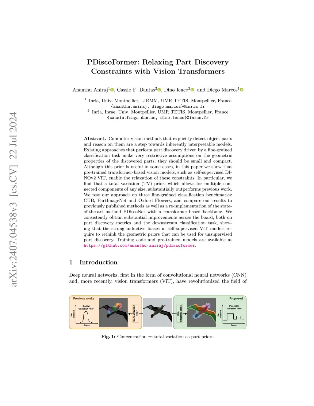 Computer vision methods that explicitly detect object parts and reason on them are a step towards inherently interpretable models. Existing approaches that perform part discovery driven by a fine-grained classification task make very restrictive assumptions on the geometric properties of the discovered parts; they should be small and compact. Although this prior is useful in some cases, in this paper we show that pre-trained transformer-based vision models, such as self-supervised DINOv2 ViT, enable the relaxation of these constraints. In particular, we find that a total variation (TV) prior, which allows for multiple connected components of any size, substantially outperforms previous work. We test our approach on three fine-grained classification benchmarks: CUB, PartImageNet and Oxford Flowers, and compare our results to previously published methods as well as a re-implementation of the state-of-the-art method PDiscoNet with a transformer-based backbone. We consistently obtain substantial improvements across the board, both on part discovery metrics and the downstream classification task, showing that the strong inductive biases in self-supervised ViT models require to rethink the geometric priors that can be used for unsupervised part discovery.