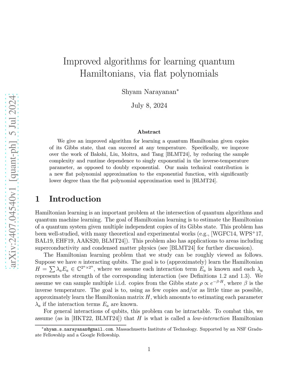We give an improved algorithm for learning a quantum Hamiltonian given copies of its Gibbs state, that can succeed at any temperature. Specifically, we improve over the work of Bakshi, Liu, Moitra, and Tang [BLMT24], by reducing the sample complexity and runtime dependence to singly exponential in the inverse-temperature parameter, as opposed to doubly exponential. Our main technical contribution is a new flat polynomial approximation to the exponential function, with significantly lower degree than the flat polynomial approximation used in [BLMT24].