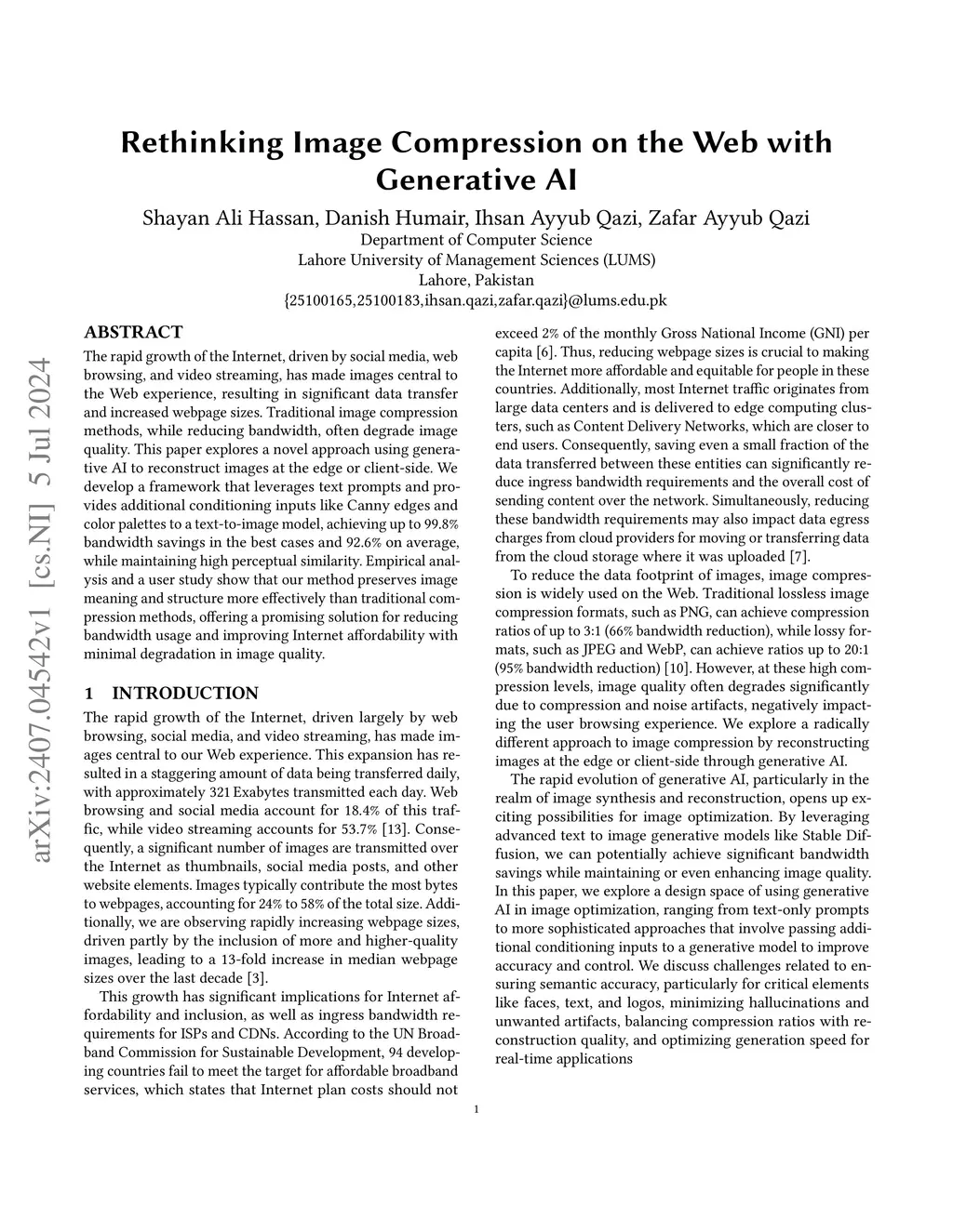 The rapid growth of the Internet, driven by social media, web browsing, and video streaming, has made images central to the Web experience, resulting in significant data transfer and increased webpage sizes. Traditional image compression methods, while reducing bandwidth, often degrade image quality. This paper explores a novel approach using generative AI to reconstruct images at the edge or client-side. We develop a framework that leverages text prompts and provides additional conditioning inputs like Canny edges and color palettes to a text-to-image model, achieving up to 99.8% bandwidth savings in the best cases and 92.6% on average, while maintaining high perceptual similarity. Empirical analysis and a user study show that our method preserves image meaning and structure more effectively than traditional compression methods, offering a promising solution for reducing bandwidth usage and improving Internet affordability with minimal degradation in image quality.