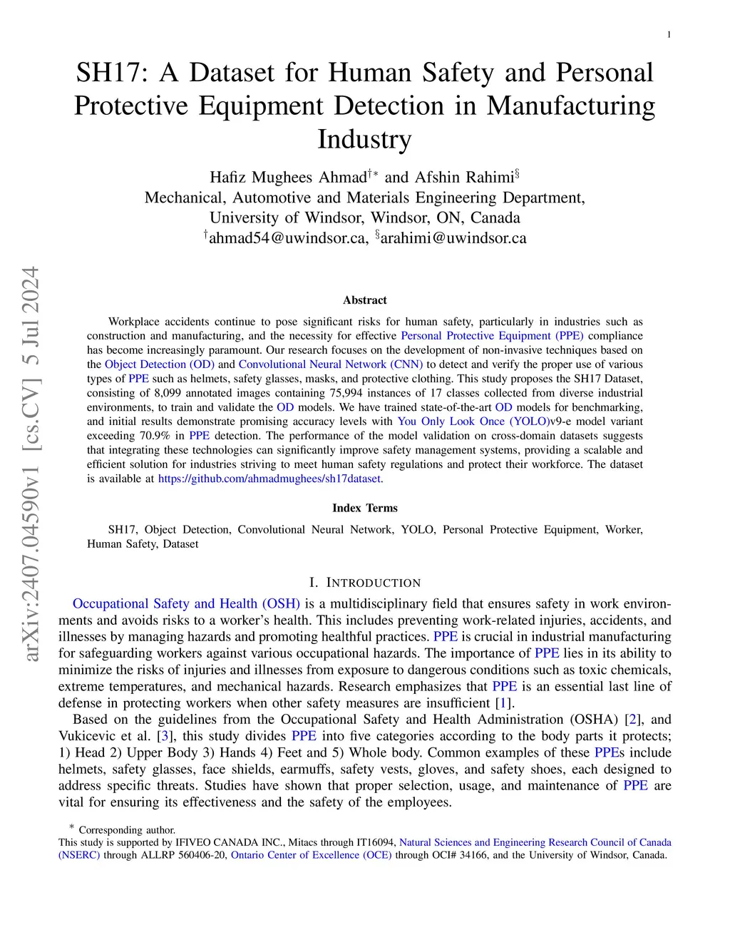 Workplace accidents continue to pose significant risks for human safety, particularly in industries such as construction and manufacturing, and the necessity for effective Personal Protective Equipment (PPE) compliance has become increasingly paramount. Our research focuses on the development of non-invasive techniques based on the Object Detection (OD) and Convolutional Neural Network (CNN) to detect and verify the proper use of various types of PPE such as helmets, safety glasses, masks, and protective clothing. This study proposes the SH17 Dataset, consisting of 8,099 annotated images containing 75,994 instances of 17 classes collected from diverse industrial environments, to train and validate the OD models. We have trained state-of-the-art OD models for benchmarking, and initial results demonstrate promising accuracy levels with You Only Look Once (YOLO)v9-e model variant exceeding 70.9% in PPE detection. The performance of the model validation on cross-domain datasets suggests that integrating these technologies can significantly improve safety management systems, providing a scalable and efficient solution for industries striving to meet human safety regulations and protect their workforce. The dataset is available at https://github.com/ahmadmughees/sh17dataset.