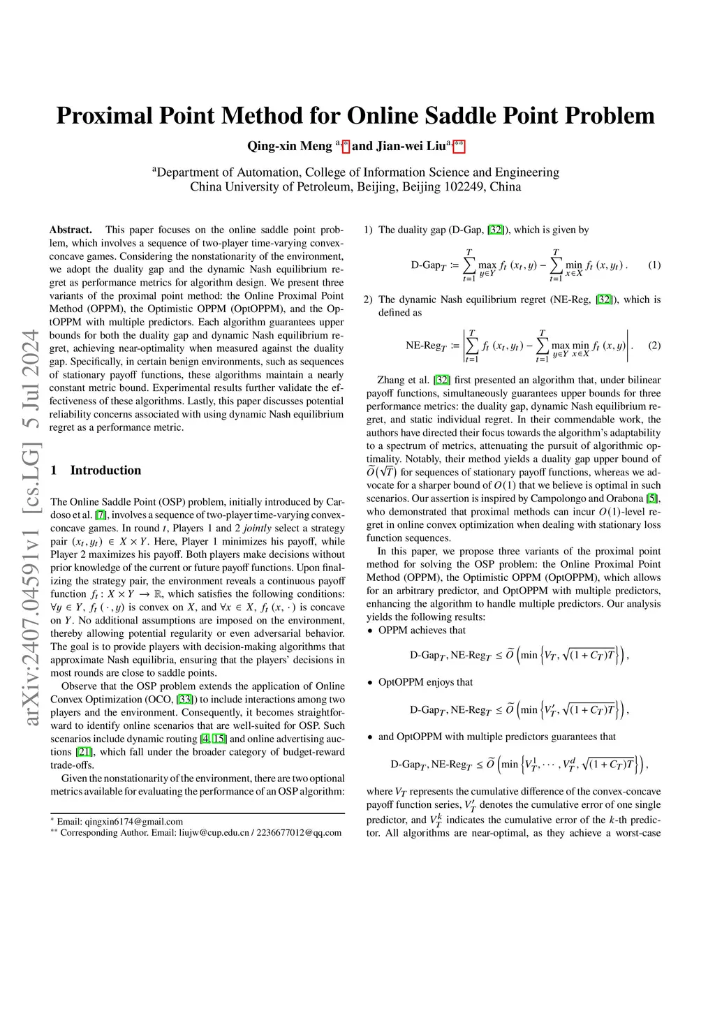 This paper focuses on the online saddle point problem, which involves a sequence of two-player time-varying convex-concave games. Considering the nonstationarity of the environment, we adopt the duality gap and the dynamic Nash equilibrium regret as performance metrics for algorithm design. We present three variants of the proximal point method: the Online Proximal Point Method (OPPM), the Optimistic OPPM (OptOPPM), and the OptOPPM with multiple predictors. Each algorithm guarantees upper bounds for both the duality gap and dynamic Nash equilibrium regret, achieving near-optimality when measured against the duality gap. Specifically, in certain benign environments, such as sequences of stationary payoff functions, these algorithms maintain a nearly constant metric bound. Experimental results further validate the effectiveness of these algorithms. Lastly, this paper discusses potential reliability concerns associated with using dynamic Nash equilibrium regret as a performance metric. The technical appendix and code can be found atthis https URL.