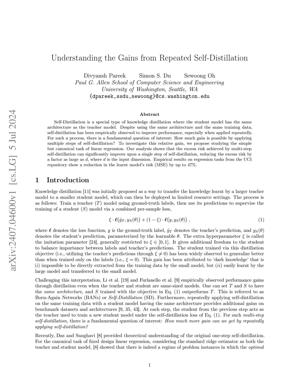 Self-Distillation is a special type of knowledge distillation where the student model has the same architecture as the teacher model. Despite using the same architecture and the same training data, self-distillation has been empirically observed to improve performance, especially when applied repeatedly. For such a process, there is a fundamental question of interest: How much gain is possible by applying multiple steps of self-distillation? To investigate this relative gain, we propose studying the simple but canonical task of linear regression. Our analysis shows that the excess risk achieved by multi-step self-distillation can significantly improve upon a single step of self-distillation, reducing the excess risk by a factor as large as , where is the input dimension. Empirical results on regression tasks from the UCI repository show a reduction in the learnt model's risk (MSE) by up to 47%.