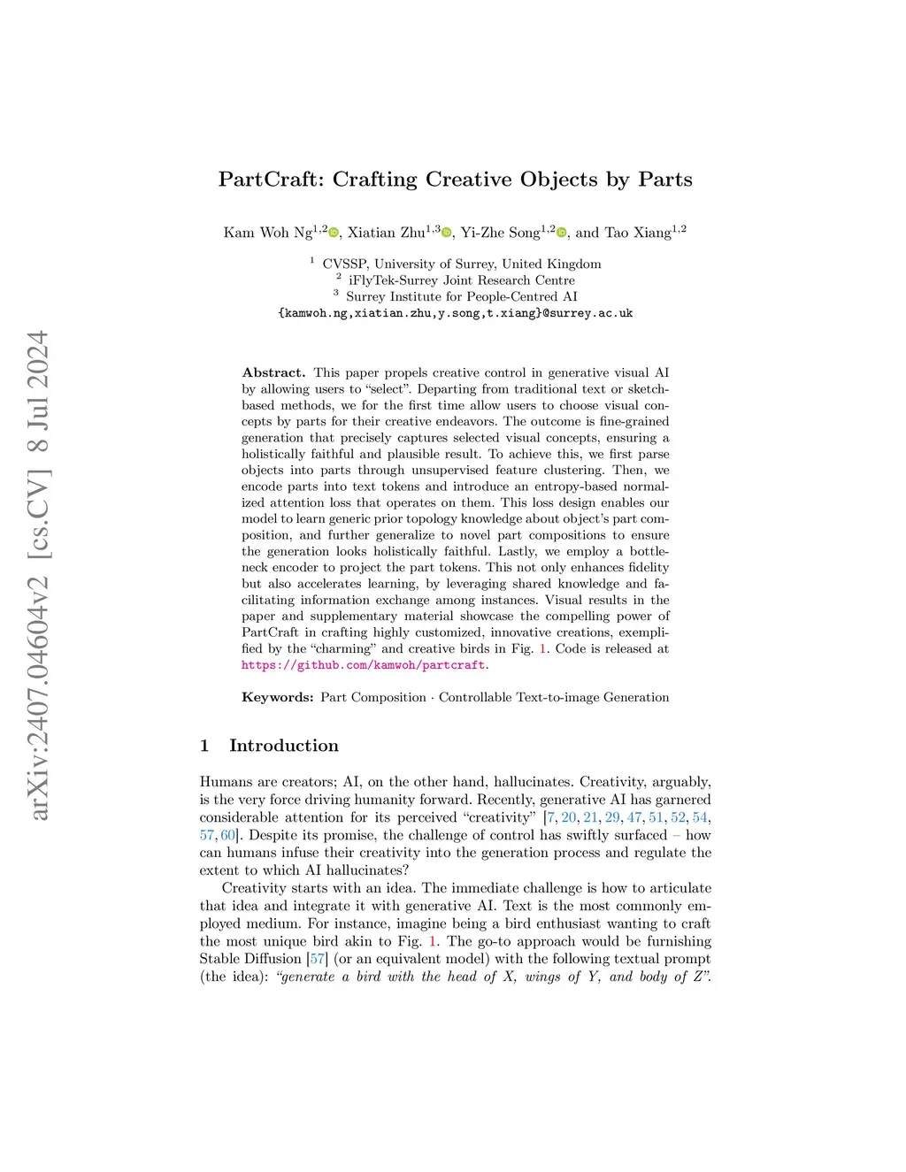This paper propels creative control in generative visual AI by allowing users to "select". Departing from traditional text or sketch-based methods, we for the first time allow users to choose visual concepts by parts for their creative endeavors. The outcome is fine-grained generation that precisely captures selected visual concepts, ensuring a holistically faithful and plausible result. To achieve this, we first parse objects into parts through unsupervised feature clustering. Then, we encode parts into text tokens and introduce an entropy-based normalized attention loss that operates on them. This loss design enables our model to learn generic prior topology knowledge about object's part composition, and further generalize to novel part compositions to ensure the generation looks holistically faithful. Lastly, we employ a bottleneck encoder to project the part tokens. This not only enhances fidelity but also accelerates learning, by leveraging shared knowledge and facilitating information exchange among instances. Visual results in the paper and supplementary material showcase the compelling power of PartCraft in crafting highly customized, innovative creations, exemplified by the "charming" and creative birds. Code is released at https://github.com/kamwoh/partcraft.