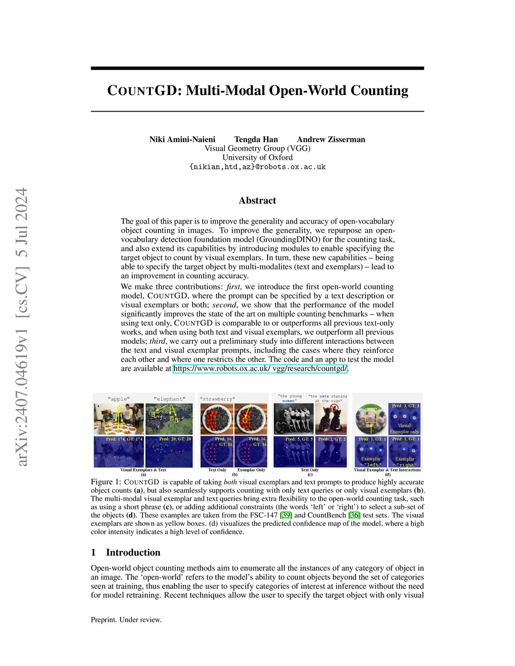 The goal of this paper is to improve the generality and accuracy of open-vocabulary object counting in images. To improve the generality, we repurpose an open-vocabulary detection foundation model (GroundingDINO) for the counting task, and also extend its capabilities by introducing modules to enable specifying the target object to count by visual exemplars. In turn, these new capabilities - being able to specify the target object by multi-modalites (text and exemplars) - lead to an improvement in counting accuracy.We make three contributions: First, we introduce the first open-world counting model, CountGD, where the prompt can be specified by a text description or visual exemplars or both; Second, we show that the performance of the model significantly improves the state of the art on multiple counting benchmarks - when using text only, CountGD is comparable to or outperforms all previous text-only works, and when using both text and visual exemplars, we outperform all previous models; Third, we carry out a preliminary study into different interactions between the text and visual exemplar prompts, including the cases where they reinforce each other and where one restricts the other. The code and an app to test the model are available atthis https URL.
