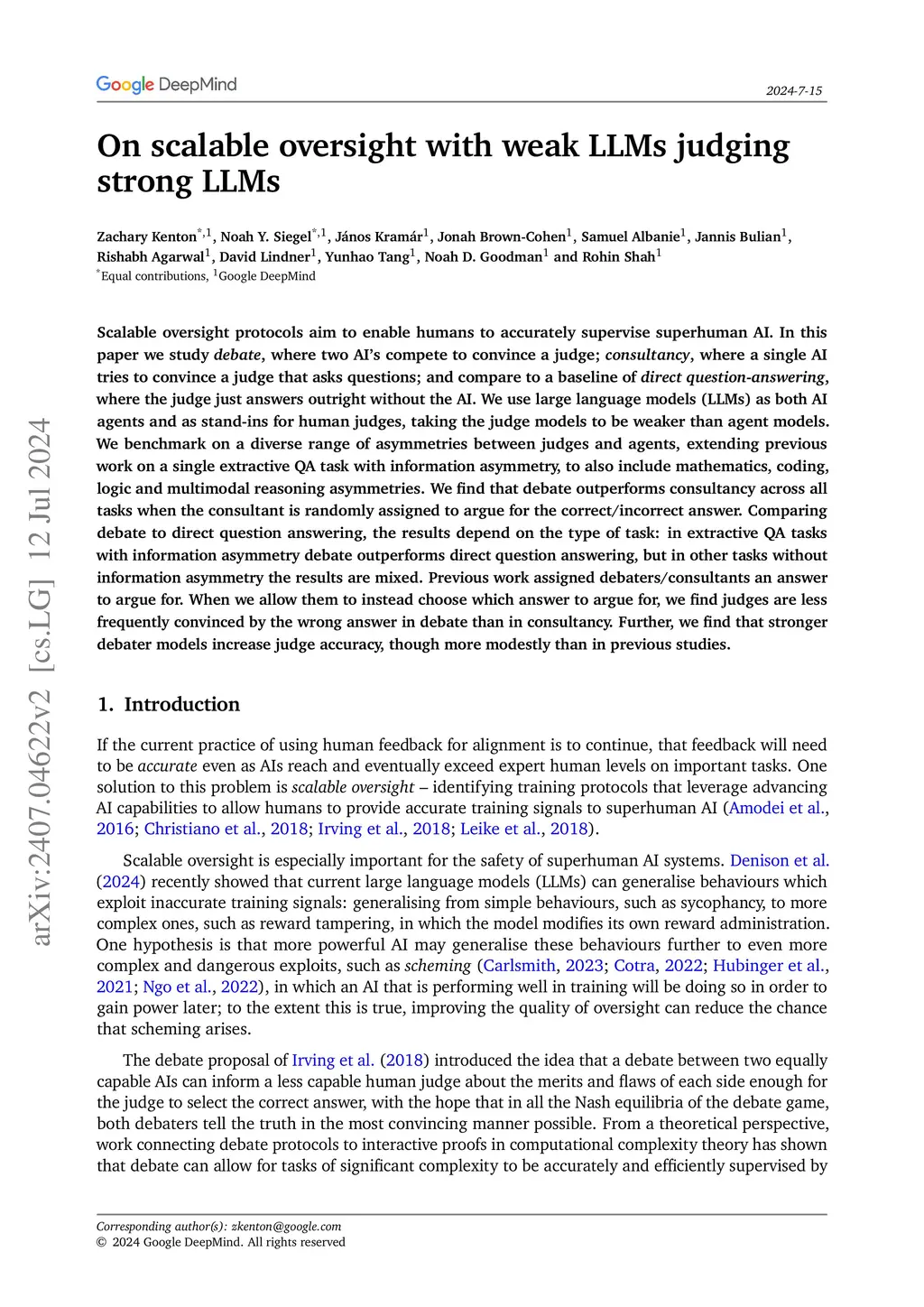 Scalable oversight protocols aim to enable humans to accurately supervise superhuman AI. In this paper we study debate, where two AI's compete to convince a judge; consultancy, where a single AI tries to convince a judge that asks questions; and compare to a baseline of direct question-answering, where the judge just answers outright without the AI. We use large language models (LLMs) as both AI agents and as stand-ins for human judges, taking the judge models to be weaker than agent models. We benchmark on a diverse range of asymmetries between judges and agents, extending previous work on a single extractive QA task with information asymmetry, to also include mathematics, coding, logic and multimodal reasoning asymmetries. We find that debate outperforms consultancy across all tasks when the consultant is randomly assigned to argue for the correct/incorrect answer. Comparing debate to direct question answering, the results depend on the type of task: in extractive QA tasks with information asymmetry debate outperforms direct question answering, but in other tasks without information asymmetry the results are mixed. Previous work assigned debaters/consultants an answer to argue for. When we allow them to instead choose which answer to argue for, we find judges are less frequently convinced by the wrong answer in debate than in consultancy. Further, we find that stronger debater models increase judge accuracy, though more modestly than in previous studies.
