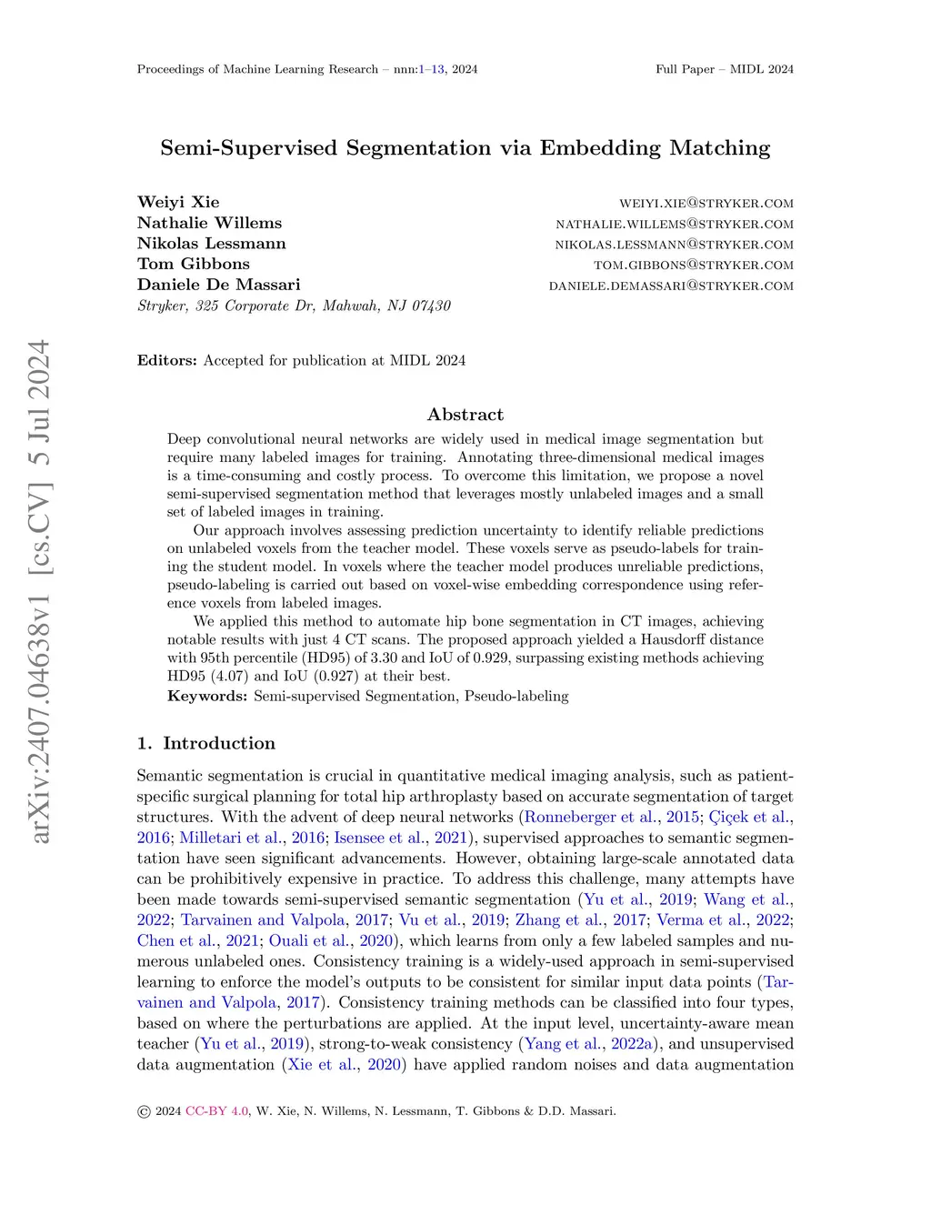 Deep convolutional neural networks are widely used in medical image segmentation but require many labeled images for training. Annotating three-dimensional medical images is a time-consuming and costly process. To overcome this limitation, we propose a novel semi-supervised segmentation method that leverages mostly unlabeled images and a small set of labeled images in training. Our approach involves assessing prediction uncertainty to identify reliable predictions on unlabeled voxels from the teacher model. These voxels serve as pseudo-labels for training the student model. In voxels where the teacher model produces unreliable predictions, pseudo-labeling is carried out based on voxel-wise embedding correspondence using reference voxels from labeled images. We applied this method to automate hip bone segmentation in CT images, achieving notable results with just 4 CT scans. The proposed approach yielded a Hausdorff distance with 95th percentile (HD95) of 3.30 and IoU of 0.929, surpassing existing methods achieving HD95 (4.07) and IoU (0.927) at their best.