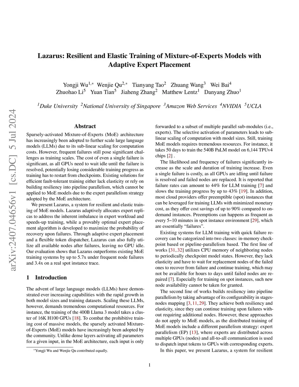 Sparsely-activated Mixture-of-Experts (MoE) architecture has increasingly been adopted to further scale large language models (LLMs). However, frequent failures still pose significant challenges as training scales. The cost of even a single failure is significant, as all GPUs need to idle wait until the failure is resolved, potentially losing considerable training progress as training has to restart from checkpoints. This problem is exacerbated by the growing use of spot instances on public clouds for model training, which despite offering substantial cost savings, introduce frequent preemptions-essentially failures that regularly occur throughout the training process. Existing solutions for efficient fault-tolerant training either lack elasticity or rely on building resiliency into pipeline parallelism, which cannot be applied to MoE models due to the expert parallelism strategy adopted by the MoE architecture.We present Lazarus, a system for resilient and elastic training of MoE models. Lazarus adaptively allocates expert replicas to address the inherent imbalance in expert workload and speeds up training, while a provably optimal expert placement algorithm is developed to maximize the probability of recovery upon failures. Through adaptive expert placement and a flexible token dispatcher, Lazarus can also fully utilize all available nodes after failures, leaving no GPU idle. Our evaluation shows that Lazarus outperforms existing MoE training systems by up to 5.7x under frequent node failures and 3.4x on a real spot instance trace.
