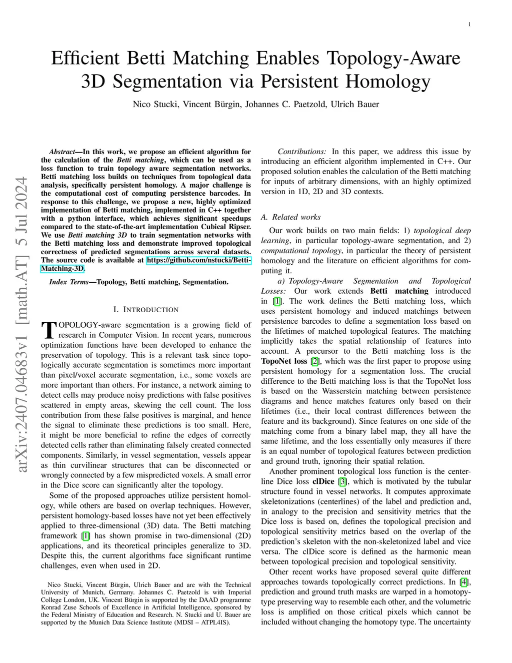 In this work, we propose an efficient algorithm for the calculation of the Betti matching, which can be used as a loss function to train topology aware segmentation networks. Betti matching loss builds on techniques from topological data analysis, specifically persistent homology. A major challenge is the computational cost of computing persistence barcodes. In response to this challenge, we propose a new, highly optimized implementation of Betti matching, implemented in C++ together with a python interface, which achieves significant speedups compared to the state-of-the-art implementation Cubical Ripser. We use Betti matching 3D to train segmentation networks with the Betti matching loss and demonstrate improved topological correctness of predicted segmentations across several datasets. The source code is available at https://github.com/nstucki/Betti-Matching-3D.