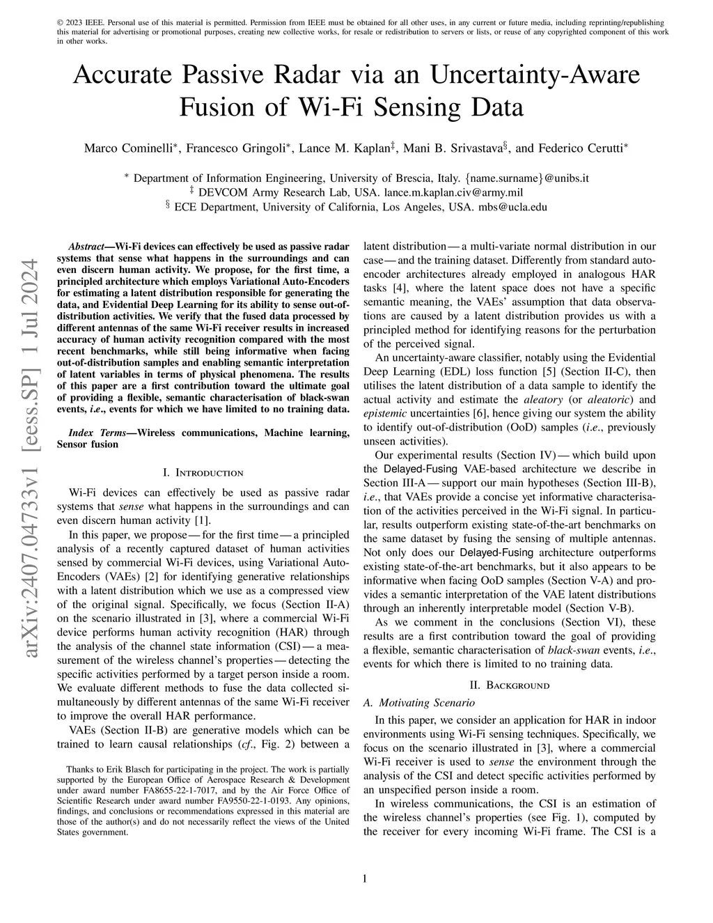 Wi-Fi devices can effectively be used as passive radar systems that sense what happens in the surroundings and can even discern human activity. We propose, for the first time, a principled architecture which employs Variational Auto-Encoders for estimating a latent distribution responsible for generating the data, and Evidential Deep Learning for its ability to sense out-of-distribution activities. We verify that the fused data processed by different antennas of the same Wi-Fi receiver results in increased accuracy of human activity recognition compared with the most recent benchmarks, while still being informative when facing out-of-distribution samples and enabling semantic interpretation of latent variables in terms of physical phenomena. The results of this paper are a first contribution toward the ultimate goal of providing a flexible, semantic characterisation of black-swan events, i.e., events for which we have limited to no training data.