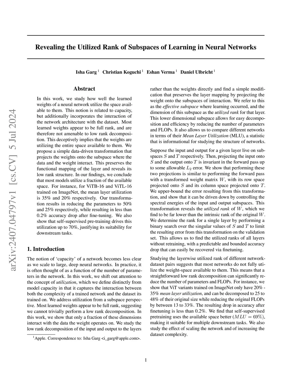 In this work, we study how well the learned weights of a neural network utilize the space available to them. This notion is related to capacity, but additionally incorporates the interaction of the network architecture with the dataset. Most learned weights appear to be full rank, and are therefore not amenable to low rank decomposition. This deceptively implies that the weights are utilizing the entire space available to them. We propose a simple data-driven transformation that projects the weights onto the subspace where the data and the weight interact. This preserves the functional mapping of the layer and reveals its low rank structure. In our findings, we conclude that most models utilize a fraction of the available space. For instance, for ViTB-16 and ViTL-16 trained on ImageNet, the mean layer utilization is 35% and 20% respectively. Our transformation results in reducing the parameters to 50% and 25% respectively, while resulting in less than 0.2% accuracy drop after fine-tuning. We also show that self-supervised pre-training drives this utilization up to 70%, justifying its suitability for downstream tasks.
