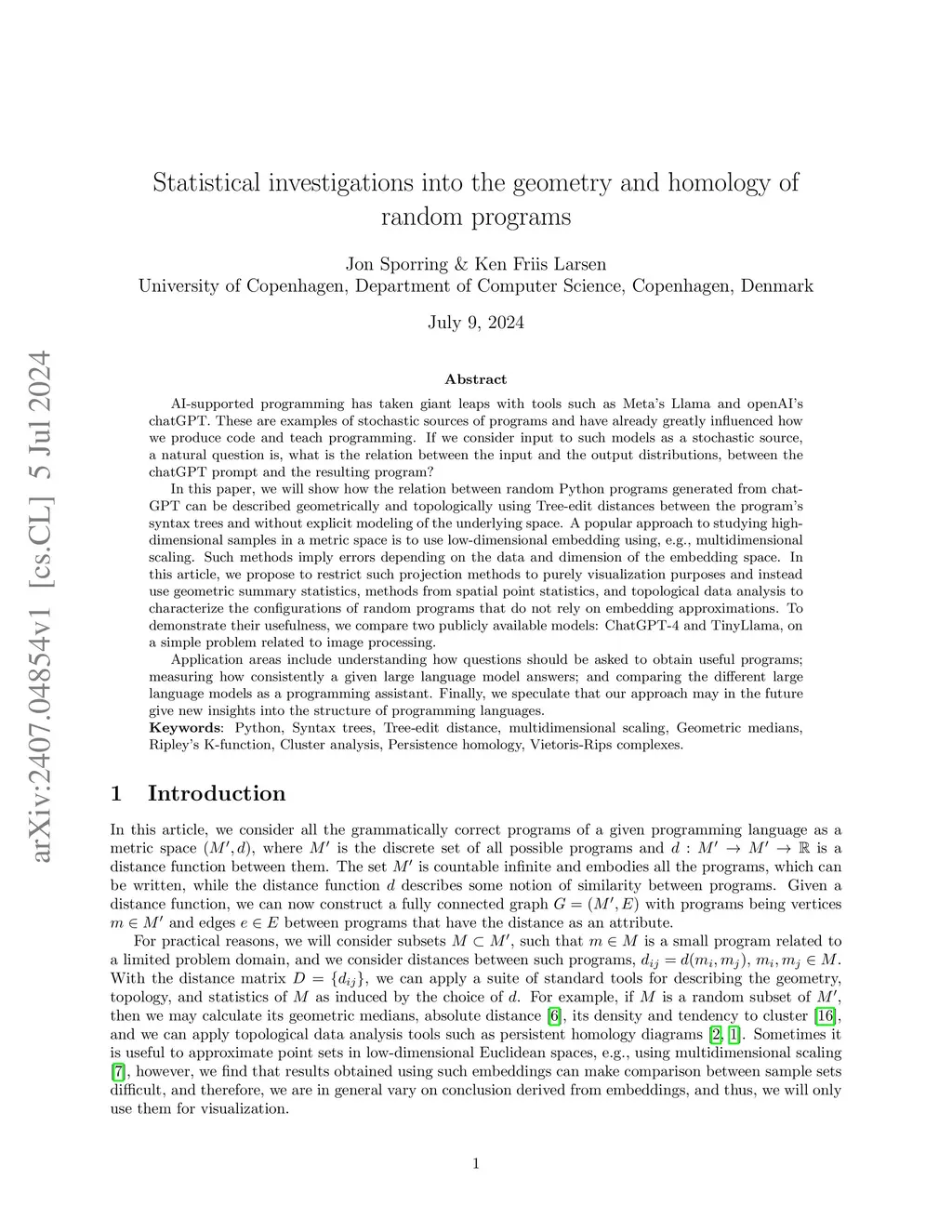 AI-supported programming has taken giant leaps with tools such as Meta's Llama and openAI's chatGPT. These are examples of stochastic sources of programs and have already greatly influenced how we produce code and teach programming. If we consider input to such models as a stochastic source, a natural question is, what is the relation between the input and the output distributions, between the chatGPT prompt and the resulting program? In this paper, we will show how the relation between random Python programs generated from chatGPT can be described geometrically and topologically using Tree-edit distances between the program's syntax trees and without explicit modeling of the underlying space. A popular approach to studying high-dimensional samples in a metric space is to use low-dimensional embedding using, e.g., multidimensional scaling. Such methods imply errors depending on the data and dimension of the embedding space. In this article, we propose to restrict such projection methods to purely visualization purposes and instead use geometric summary statistics, methods from spatial point statistics, and topological data analysis to characterize the configurations of random programs that do not rely on embedding approximations. To demonstrate their usefulness, we compare two publicly available models: ChatGPT-4 and TinyLlama, on a simple problem related to image processing. Application areas include understanding how questions should be asked to obtain useful programs; measuring how consistently a given large language model answers; and comparing the different large language models as a programming assistant. Finally, we speculate that our approach may in the future give new insights into the structure of programming languages.