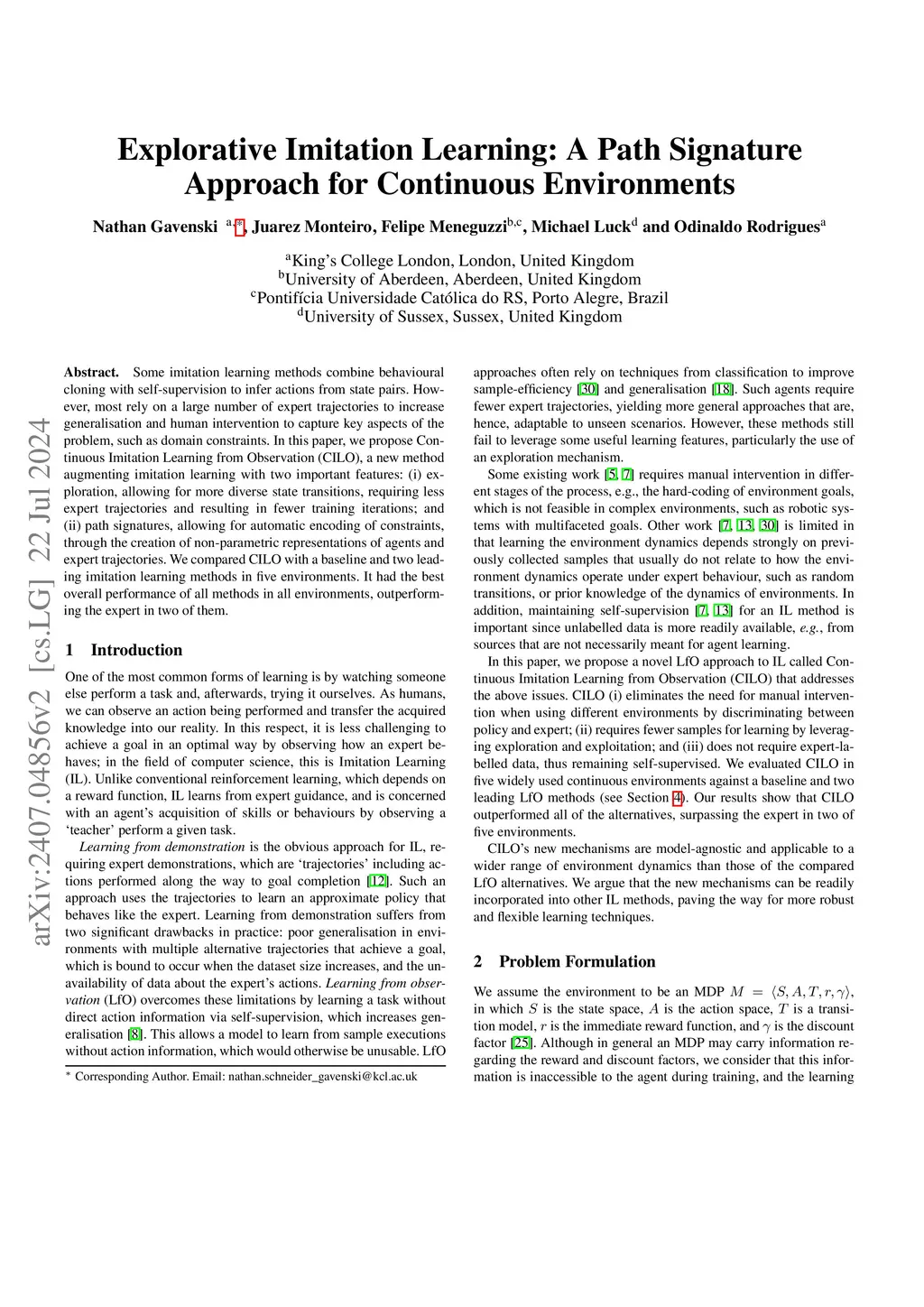 Some imitation learning methods combine behavioural cloning with self-supervision to infer actions from state pairs. However, most rely on a large number of expert trajectories to increase generalisation and human intervention to capture key aspects of the problem, such as domain constraints. In this paper, we propose Continuous Imitation Learning from Observation (CILO), a new method augmenting imitation learning with two important features: (i) exploration, allowing for more diverse state transitions, requiring less expert trajectories and resulting in fewer training iterations; and (ii) path signatures, allowing for automatic encoding of constraints, through the creation of non-parametric representations of agents and expert trajectories. We compared CILO with a baseline and two leading imitation learning methods in five environments. It had the best overall performance of all methods in all environments, outperforming the expert in two of them.