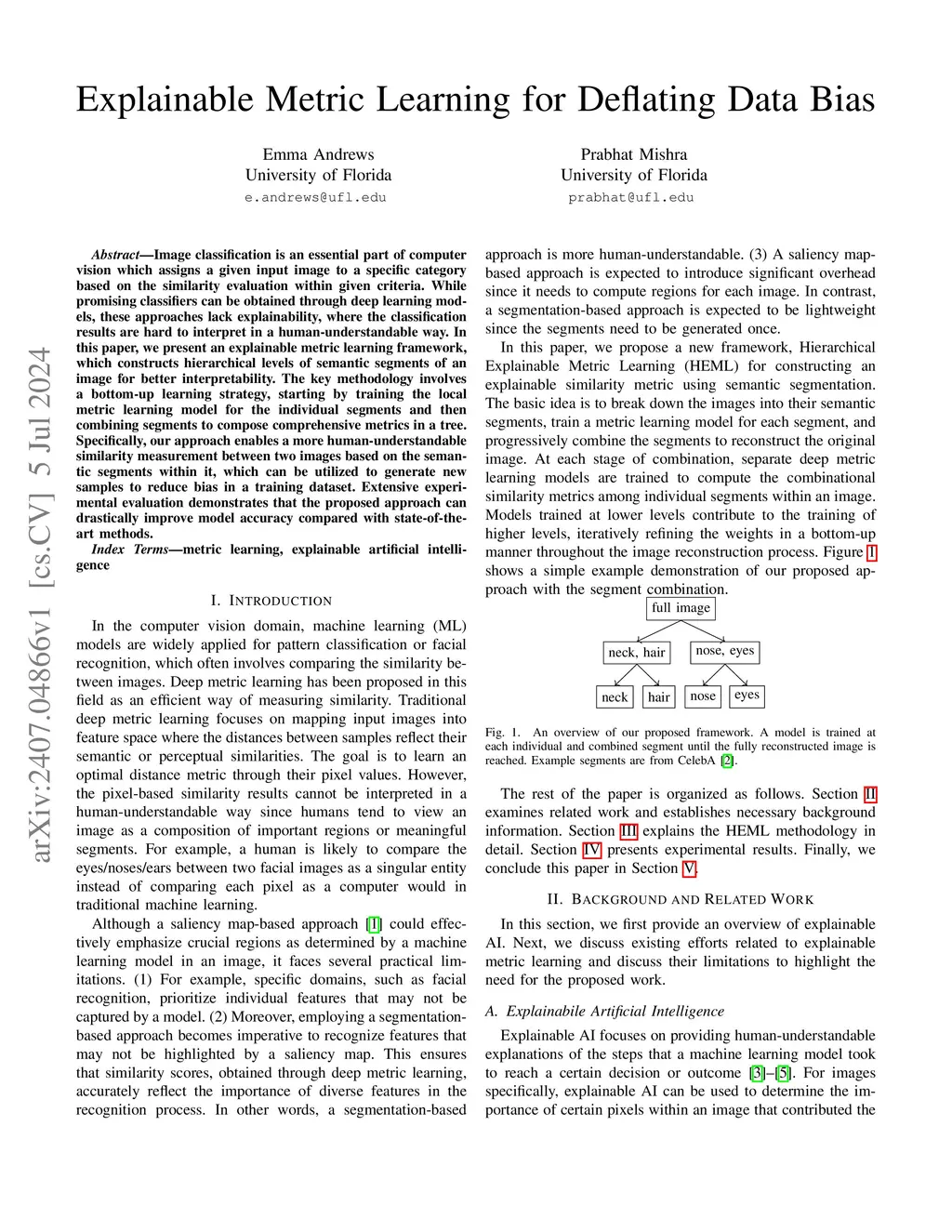 Image classification is an essential part of computer vision which assigns a given input image to a specific category based on the similarity evaluation within given criteria. While promising classifiers can be obtained through deep learning models, these approaches lack explainability, where the classification results are hard to interpret in a human-understandable way. In this paper, we present an explainable metric learning framework, which constructs hierarchical levels of semantic segments of an image for better interpretability. The key methodology involves a bottom-up learning strategy, starting by training the local metric learning model for the individual segments and then combining segments to compose comprehensive metrics in a tree. Specifically, our approach enables a more human-understandable similarity measurement between two images based on the semantic segments within it, which can be utilized to generate new samples to reduce bias in a training dataset. Extensive experimental evaluation demonstrates that the proposed approach can drastically improve model accuracy compared with state-of-the-art methods.