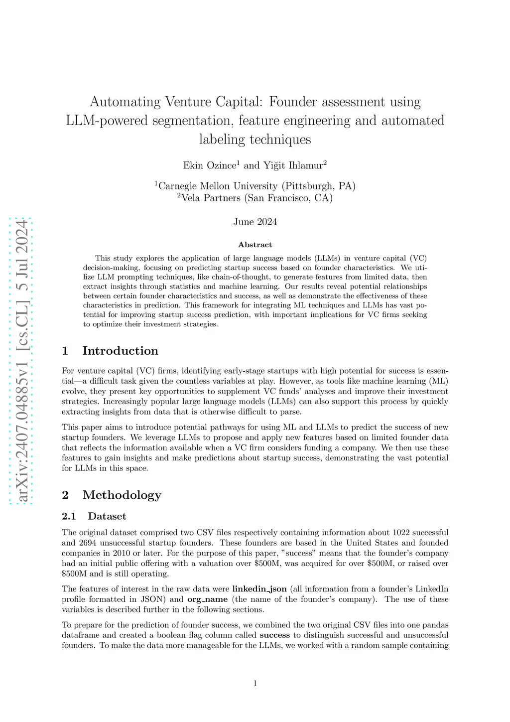 This study explores the application of large language models (LLMs) in venture capital (VC) decision-making, focusing on predicting startup success based on founder characteristics. We utilize LLM prompting techniques, like chain-of-thought, to generate features from limited data, then extract insights through statistics and machine learning. Our results reveal potential relationships between certain founder characteristics and success, as well as demonstrate the effectiveness of these characteristics in prediction. This framework for integrating ML techniques and LLMs has vast potential for improving startup success prediction, with important implications for VC firms seeking to optimize their investment strategies.