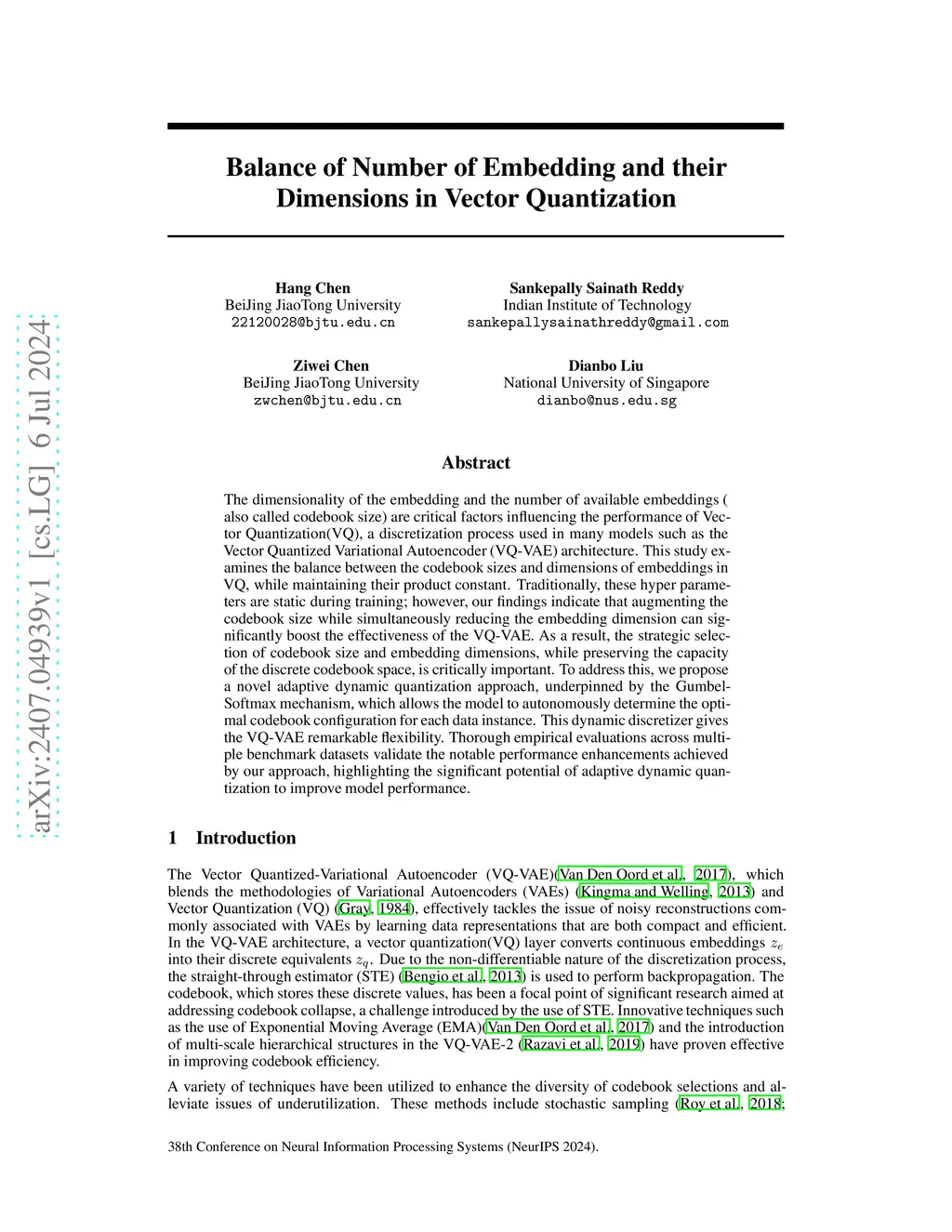 The dimensionality of the embedding and the number of available embeddings ( also called codebook size) are critical factors influencing the performance of Vector Quantization(VQ), a discretization process used in many models such as the Vector Quantized Variational Autoencoder (VQ-VAE) architecture. This study examines the balance between the codebook sizes and dimensions of embeddings in VQ, while maintaining their product constant. Traditionally, these hyper parameters are static during training; however, our findings indicate that augmenting the codebook size while simultaneously reducing the embedding dimension can significantly boost the effectiveness of the VQ-VAE. As a result, the strategic selection of codebook size and embedding dimensions, while preserving the capacity of the discrete codebook space, is critically important. To address this, we propose a novel adaptive dynamic quantization approach, underpinned by the Gumbel-Softmax mechanism, which allows the model to autonomously determine the optimal codebook configuration for each data instance. This dynamic discretizer gives the VQ-VAE remarkable flexibility. Thorough empirical evaluations across multiple benchmark datasets validate the notable performance enhancements achieved by our approach, highlighting the significant potential of adaptive dynamic quantization to improve model performance.