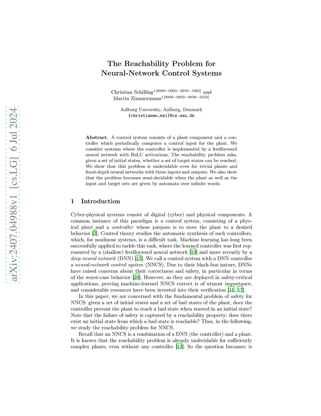 A control system consists of a plant component and a controller which periodically computes a control input for the plant. We consider systems where the controller is implemented by a feedforward neural network with ReLU activations. The reachability problem asks, given a set of initial states, whether a set of target states can be reached. We show that this problem is undecidable even for trivial plants and fixed-depth neural networks with three inputs and outputs. We also show that the problem becomes semi-decidable when the plant as well as the input and target sets are given by automata over infinite words.