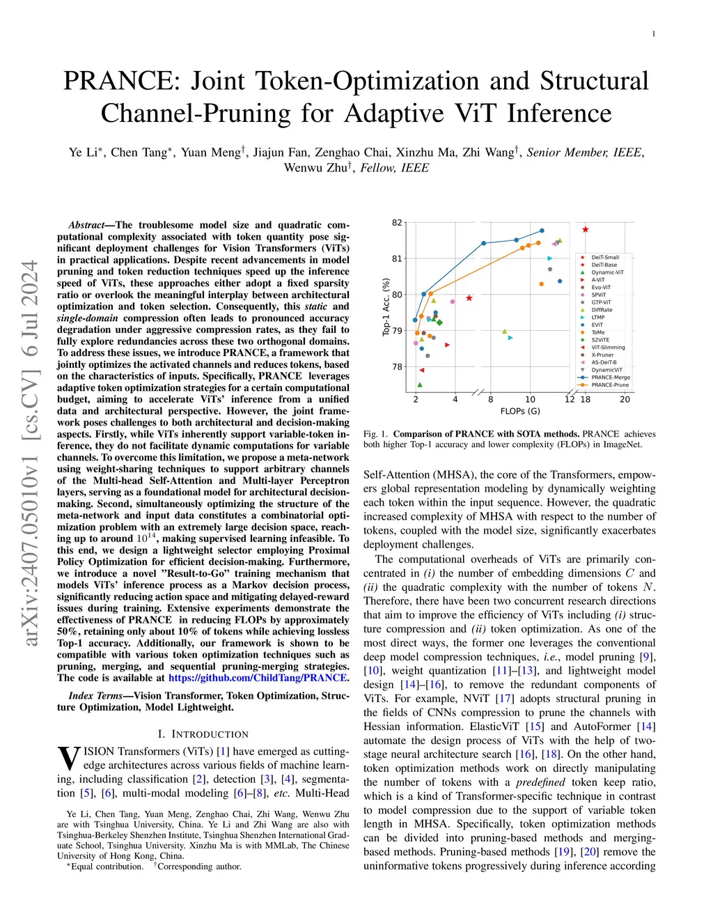 We introduce PRANCE, a Vision Transformer compression framework that jointly optimizes the activated channels and reduces tokens, based on the characteristics of inputs. Specifically, PRANCE~ leverages adaptive token optimization strategies for a certain computational budget, aiming to accelerate ViTs' inference from a unified data and architectural perspective. However, the joint framework poses challenges to both architectural and decision-making aspects. Firstly, while ViTs inherently support variable-token inference, they do not facilitate dynamic computations for variable channels. To overcome this limitation, we propose a meta-network using weight-sharing techniques to support arbitrary channels of the Multi-head Self-Attention and Multi-layer Perceptron layers, serving as a foundational model for architectural decision-making. Second, simultaneously optimizing the structure of the meta-network and input data constitutes a combinatorial optimization problem with an extremely large decision space, reaching up to around , making supervised learning infeasible. To this end, we design a lightweight selector employing Proximal Policy Optimization for efficient decision-making. Furthermore, we introduce a novel "Result-to-Go" training mechanism that models ViTs' inference process as a Markov decision process, significantly reducing action space and mitigating delayed-reward issues during training. Extensive experiments demonstrate the effectiveness of PRANCE~ in reducing FLOPs by approximately 50\%, retaining only about 10\% of tokens while achieving lossless Top-1 accuracy. Additionally, our framework is shown to be compatible with various token optimization techniques such as pruning, merging, and sequential pruning-merging strategies. The code is available at \href{https://github.com/ChildTang/PRANCE}{https://github.com/ChildTang/PRANCE}.