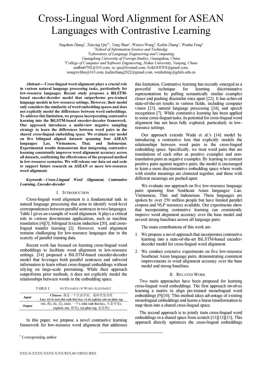 Cross-Lingual Word Alignment for ASEAN Languages with Contrastive