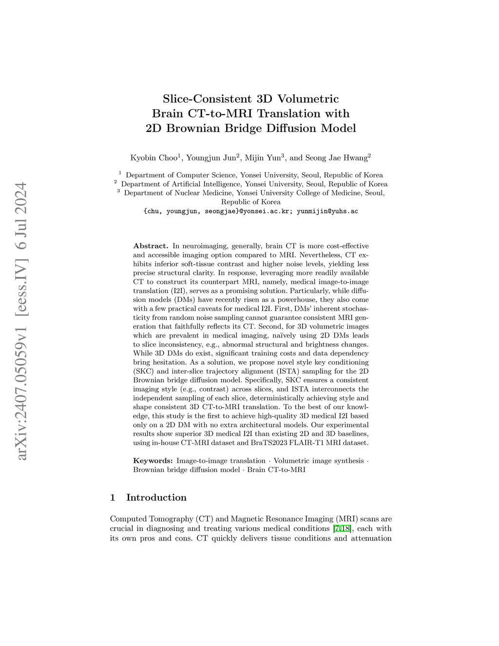 In neuroimaging, generally, brain CT is more cost-effective and accessible imaging option compared to MRI. Nevertheless, CT exhibits inferior soft-tissue contrast and higher noise levels, yielding less precise structural clarity. In response, leveraging more readily available CT to construct its counterpart MRI, namely, medical image-to-image translation (I2I), serves as a promising solution. Particularly, while diffusion models (DMs) have recently risen as a powerhouse, they also come with a few practical caveats for medical I2I. First, DMs' inherent stochasticity from random noise sampling cannot guarantee consistent MRI generation that faithfully reflects its CT. Second, for 3D volumetric images which are prevalent in medical imaging, naively using 2D DMs leads to slice inconsistency, e.g., abnormal structural and brightness changes. While 3D DMs do exist, significant training costs and data dependency bring hesitation. As a solution, we propose novel style key conditioning (SKC) and inter-slice trajectory alignment (ISTA) sampling for the 2D Brownian bridge diffusion model. Specifically, SKC ensures a consistent imaging style (e.g., contrast) across slices, and ISTA interconnects the independent sampling of each slice, deterministically achieving style and shape consistent 3D CT-to-MRI translation. To the best of our knowledge, this study is the first to achieve high-quality 3D medical I2I based only on a 2D DM with no extra architectural models. Our experimental results show superior 3D medical I2I than existing 2D and 3D baselines, using in-house CT-MRI dataset and BraTS2023 FLAIR-T1 MRI dataset.