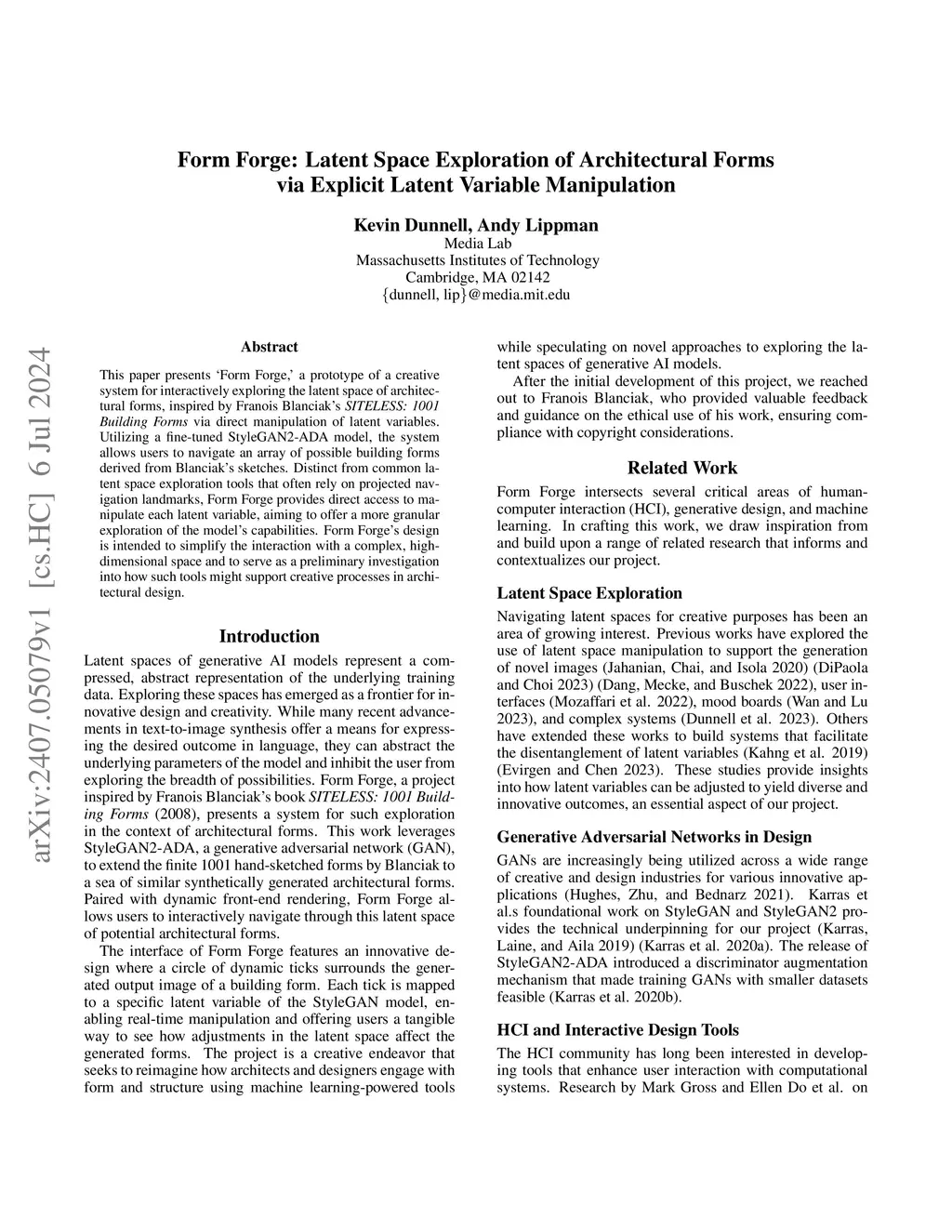 This paper presents 'Form Forge,' a prototype of a creative system for interactively exploring the latent space of architectural forms, inspired by Franois Blanciak's SITELESS: 1001 Building Forms via direct manipulation of latent variables. Utilizing a fine-tuned StyleGAN2-ADA model, the system allows users to navigate an array of possible building forms derived from Blanciak's sketches. Distinct from common latent space exploration tools that often rely on projected navigation landmarks, Form Forge provides direct access to manipulate each latent variable, aiming to offer a more granular exploration of the model's capabilities. Form Forge's design is intended to simplify the interaction with a complex, high-dimensional space and to serve as a preliminary investigation into how such tools might support creative processes in architectural design.