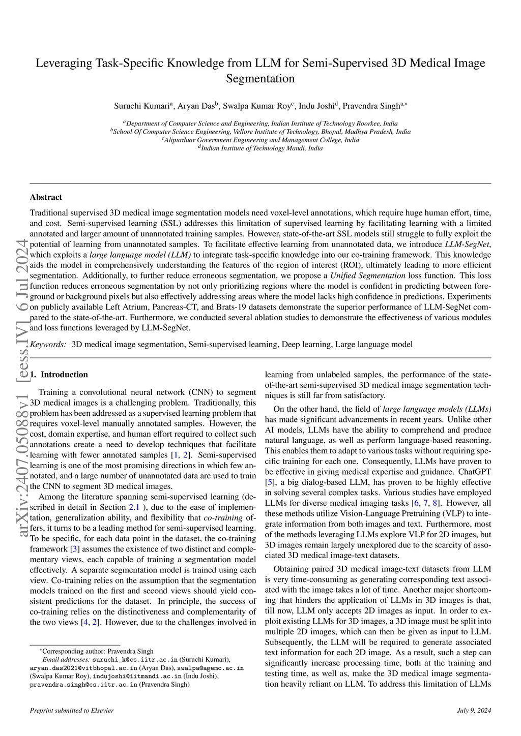 Traditional supervised 3D medical image segmentation models need voxel-level annotations, which require huge human effort, time, and cost. Semi-supervised learning (SSL) addresses this limitation of supervised learning by facilitating learning with a limited annotated and larger amount of unannotated training samples. However, state-of-the-art SSL models still struggle to fully exploit the potential of learning from unannotated samples. To facilitate effective learning from unannotated data, we introduce LLM-SegNet, which exploits a large language model (LLM) to integrate task-specific knowledge into our co-training framework. This knowledge aids the model in comprehensively understanding the features of the region of interest (ROI), ultimately leading to more efficient segmentation. Additionally, to further reduce erroneous segmentation, we propose a Unified Segmentation loss function. This loss function reduces erroneous segmentation by not only prioritizing regions where the model is confident in predicting between foreground or background pixels but also effectively addressing areas where the model lacks high confidence in predictions. Experiments on publicly available Left Atrium, Pancreas-CT, and Brats-19 datasets demonstrate the superior performance of LLM-SegNet compared to the state-of-the-art. Furthermore, we conducted several ablation studies to demonstrate the effectiveness of various modules and loss functions leveraged by LLM-SegNet.