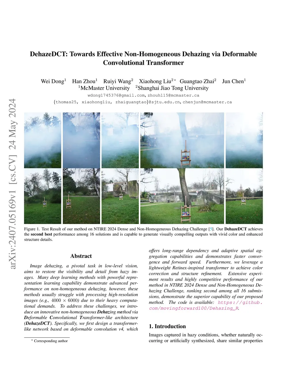 Image dehazing, a pivotal task in low-level vision, aims to restore the visibility and detail from hazy images. Many deep learning methods with powerful representation learning capability demonstrate advanced performance on non-homogeneous dehazing, however, these methods usually struggle with processing high-resolution images (e.g., ) due to their heavy computational demands. To address these challenges, we introduce an innovative non-homogeneous Dehazing method via Deformable Convolutional Transformer-like architecture (DehazeDCT). Specifically, we first design a transformer-like network based on deformable convolution v4, which offers long-range dependency and adaptive spatial aggregation capabilities and demonstrates faster convergence and forward speed. Furthermore, we leverage a lightweight Retinex-inspired transformer to achieve color correction and structure refinement. Extensive experiment results and highly competitive performance of our method in NTIRE 2024 Dense and Non-Homogeneous Dehazing Challenge, ranking second among all 16 submissions, demonstrate the superior capability of our proposed method. The code is available: https://github.com/movingforward100/Dehazing_R.