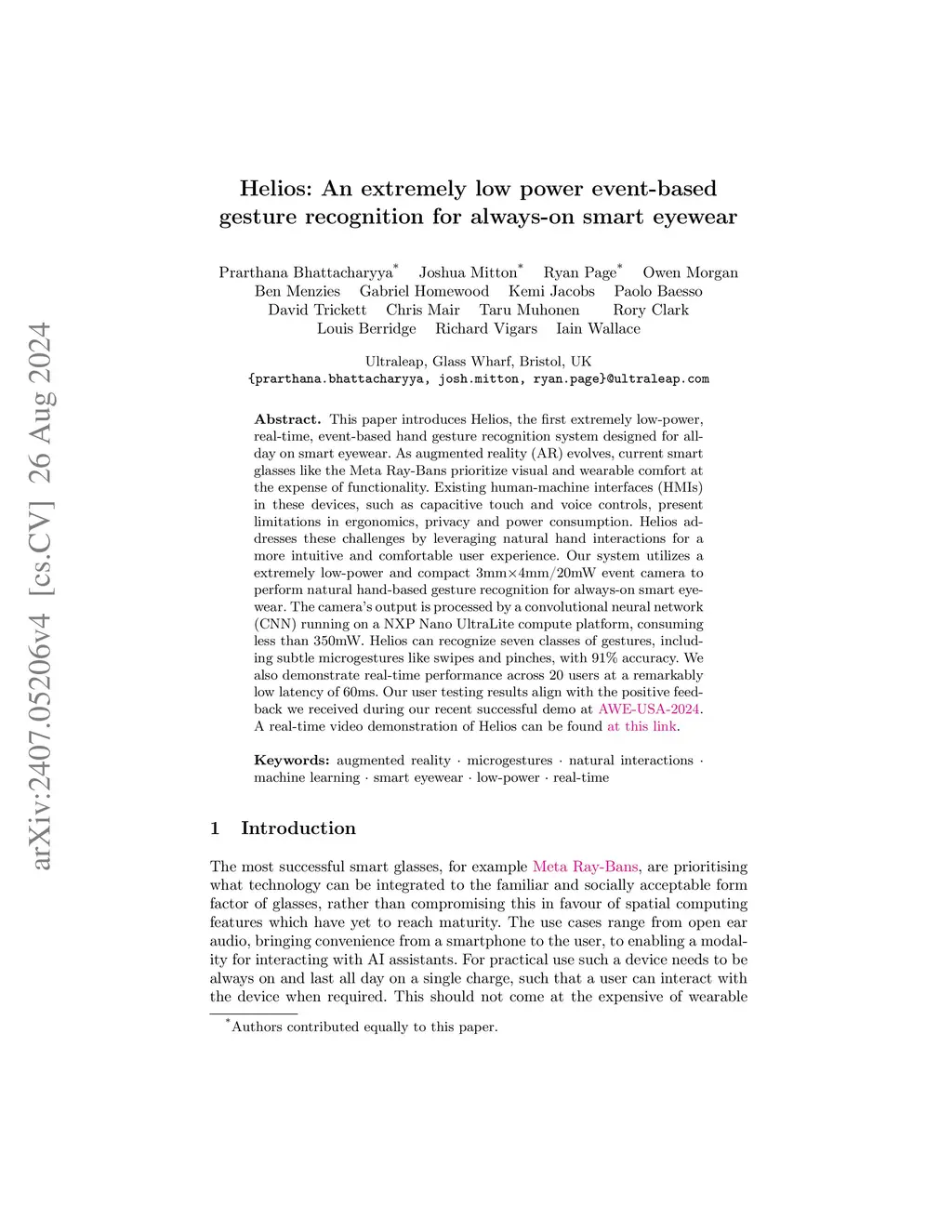 This paper introduces Helios, the first extremely low-power, real-time, event-based hand gesture recognition system designed for all-day on smart eyewear. As augmented reality (AR) evolves, current smart glasses like the Meta Ray-Bans prioritize visual and wearable comfort at the expense of functionality. Existing human-machine interfaces (HMIs) in these devices, such as capacitive touch and voice controls, present limitations in ergonomics, privacy and power consumption. Helios addresses these challenges by leveraging natural hand interactions for a more intuitive and comfortable user experience. Our system utilizes a extremely low-power and compact 3mmx4mm/20mW event camera to perform natural hand-based gesture recognition for always-on smart eyewear. The camera's output is processed by a convolutional neural network (CNN) running on a NXP Nano UltraLite compute platform, consuming less than 350mW. Helios can recognize seven classes of gestures, including subtle microgestures like swipes and pinches, with 91% accuracy. We also demonstrate real-time performance across 20 users at a remarkably low latency of 60ms. Our user testing results align with the positive feedback we received during our recent successful demo at AWE-USA-2024.