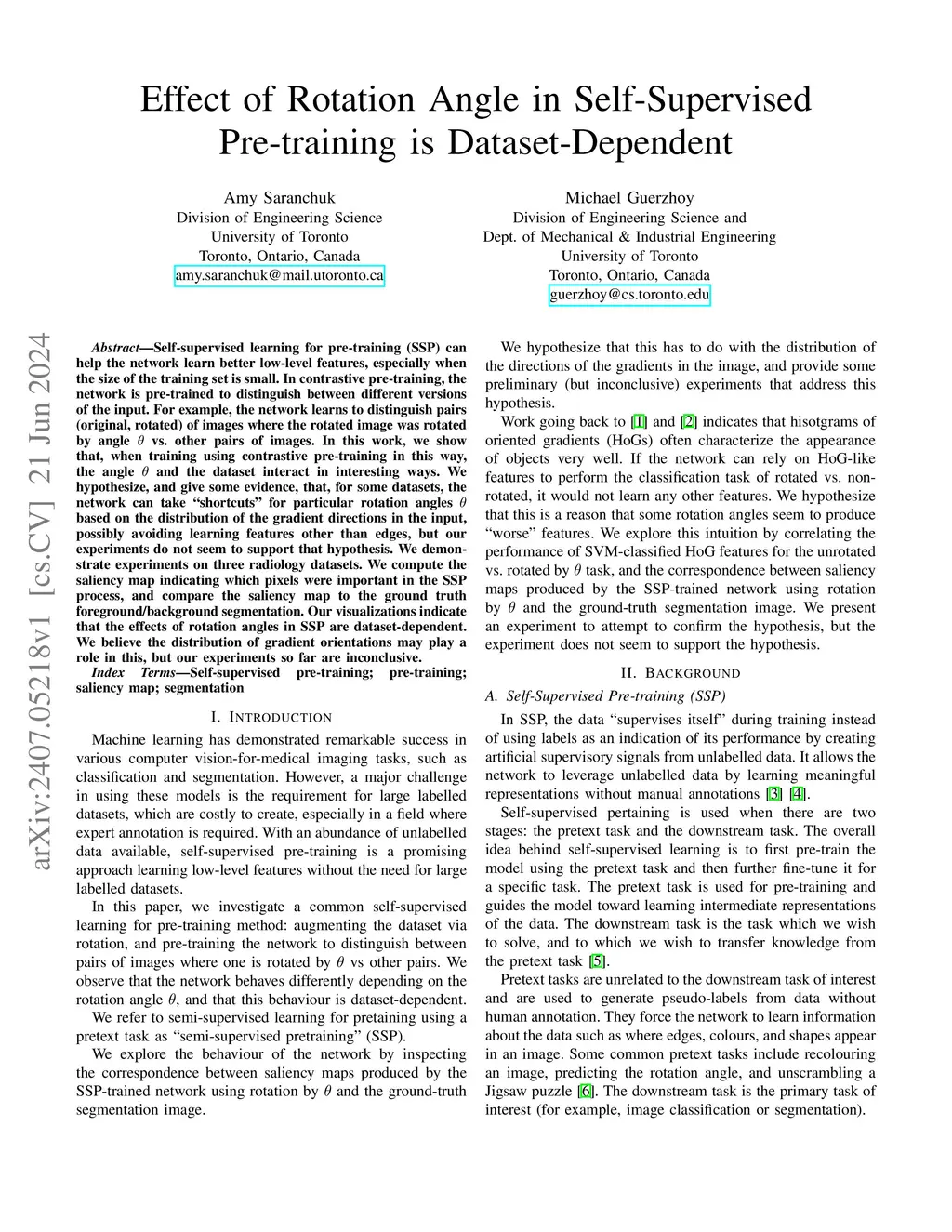 Self-supervised learning for pre-training (SSP) can help the network learn better low-level features, especially when the size of the training set is small. In contrastive pre-training, the network is pre-trained to distinguish between different versions of the input. For example, the network learns to distinguish pairs (original, rotated) of images where the rotated image was rotated by angle vs. other pairs of images. In this work, we show that, when training using contrastive pre-training in this way, the angle and the dataset interact in interesting ways. We hypothesize, and give some evidence, that, for some datasets, the network can take "shortcuts" for particular rotation angles based on the distribution of the gradient directions in the input, possibly avoiding learning features other than edges, but our experiments do not seem to support that hypothesis. We demonstrate experiments on three radiology datasets. We compute the saliency map indicating which pixels were important in the SSP process, and compare the saliency map to the ground truth foreground/background segmentation. Our visualizations indicate that the effects of rotation angles in SSP are dataset-dependent. We believe the distribution of gradient orientations may play a role in this, but our experiments so far are inconclusive.