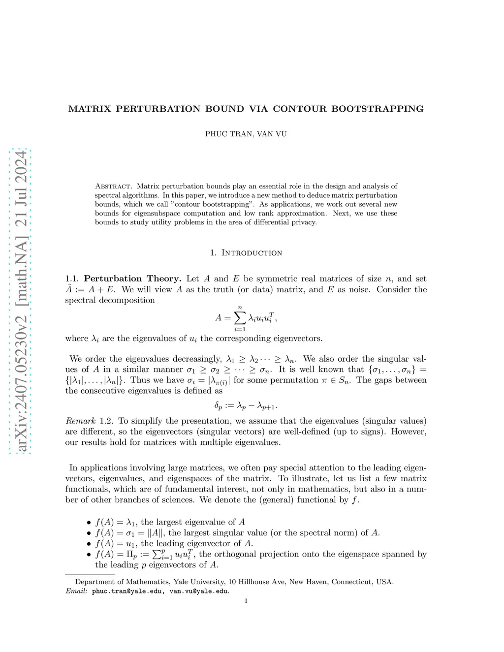 Matrix perturbation bounds play an essential role in the design and analysis of spectral algorithms. In this paper, we introduce a new method to deduce matrix perturbation bounds, which we call "contour bootstrapping". As applications, we work out several new bounds for eigensubspace computation and low rank approximation. Next, we use these bounds to study utility problems in the area of differential privacy.