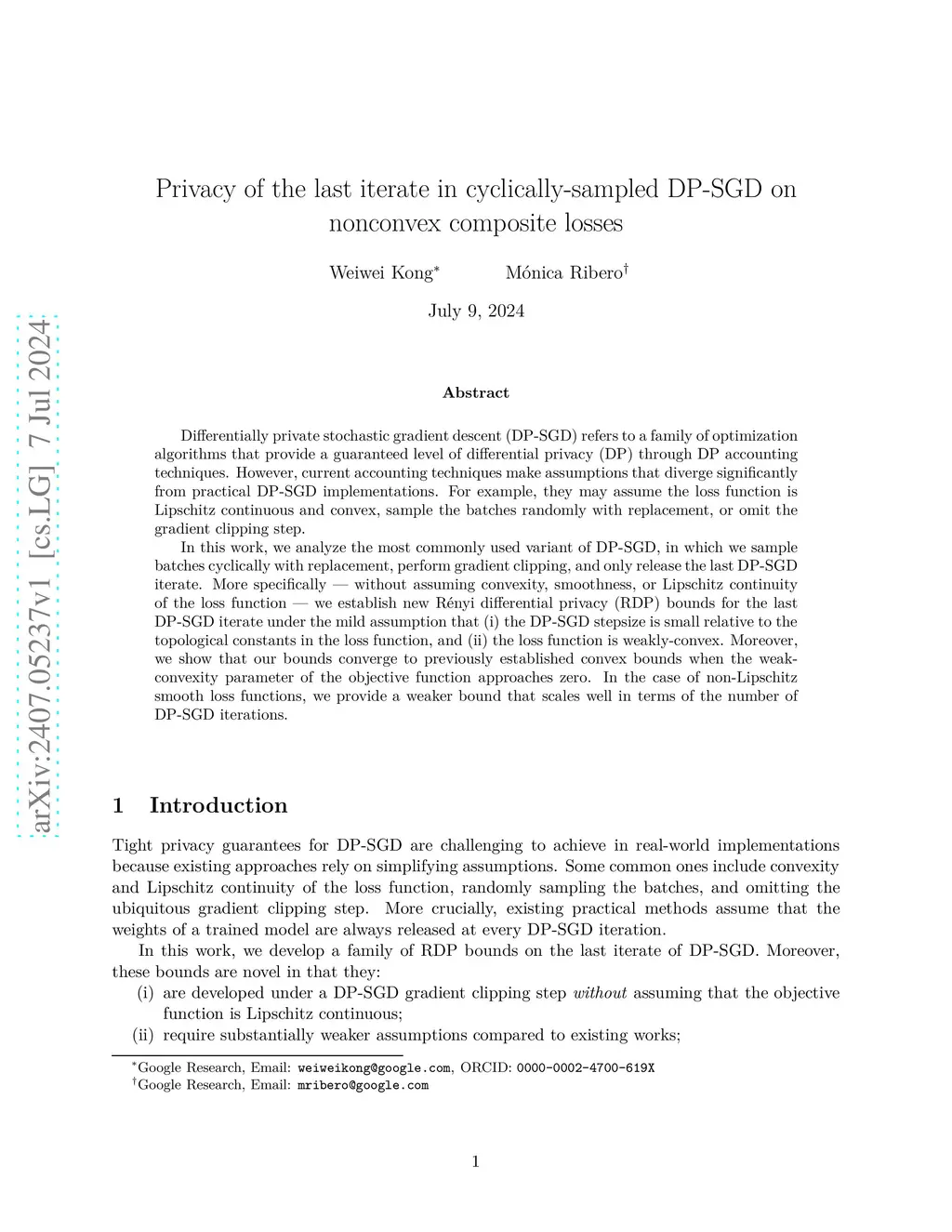 Differentially-private stochastic gradient descent (DP-SGD) is a family of iterative machine learning training algorithms that privatize gradients to generate a sequence of differentially-private (DP) model parameters. It is also the standard tool used to train DP models in practice, even though most users are only interested in protecting the privacy of the final model. Tight DP accounting for the last iterate would minimize the amount of noise required while maintaining the same privacy guarantee and potentially increasing model utility. However, last-iterate accounting is challenging, and existing works require strong assumptions not satisfied by most implementations. These include assuming (i) the global sensitivity constant is known - to avoid gradient clipping; (ii) the loss function is Lipschitz or convex; and (iii) input batches are sampled randomly.In this work, we forego any unrealistic assumptions and provide privacy bounds for the most commonly used variant of DP-SGD, in which data is traversed cyclically, gradients are clipped, and only the last model is released. More specifically, we establish new Renyi differential privacy (RDP) upper bounds for the last iterate under realistic assumptions of small stepsize and Lipschitz smoothness of the loss function. Our general bounds also recover the special-case convex bounds when the weak-convexity parameter of the objective function approaches zero and no clipping is performed. The approach itself leverages optimal transport techniques for last iterate bounds, which is a nontrivial task when the data is traversed cyclically and the loss function is nonconvex.