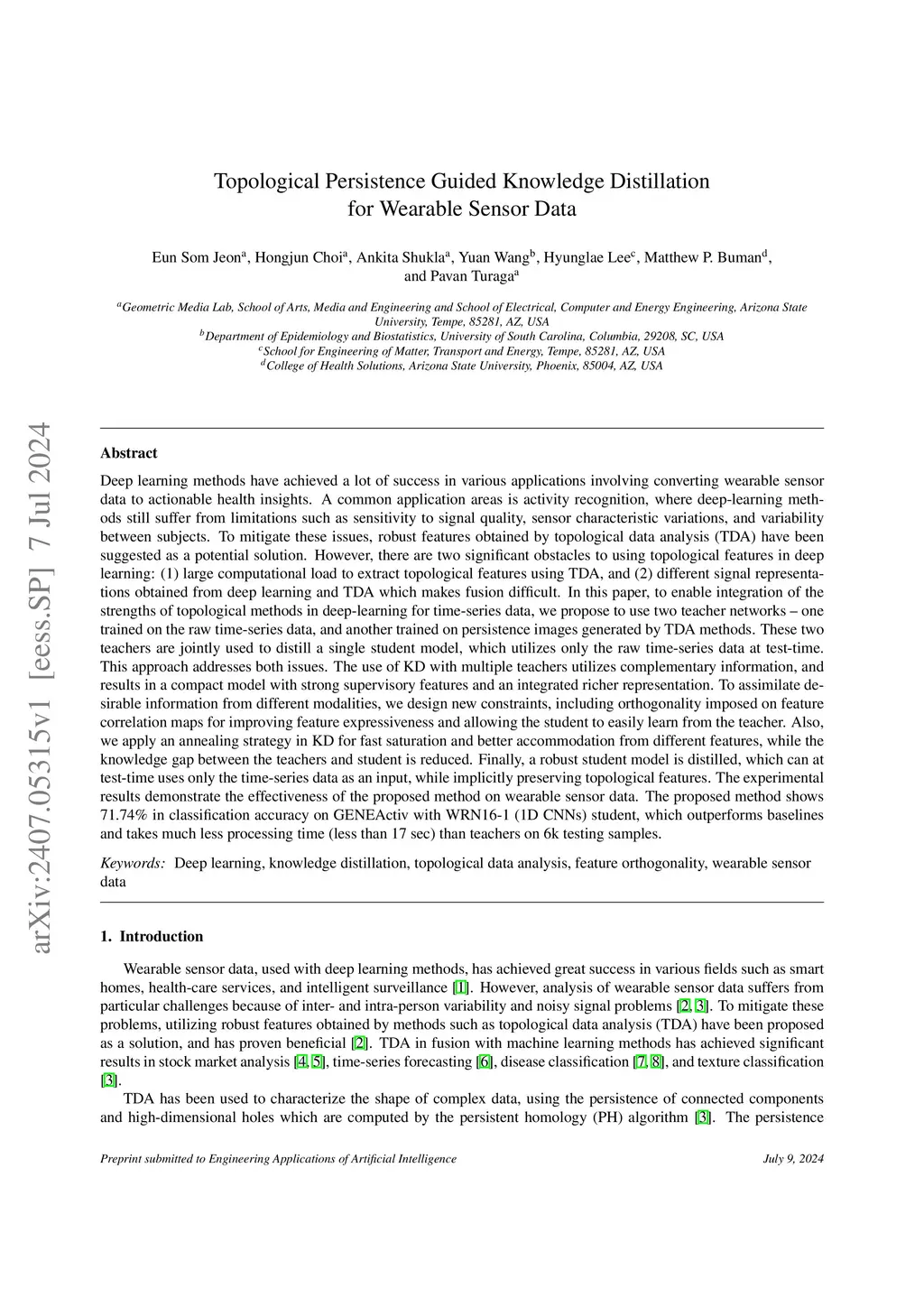 Deep learning methods have achieved a lot of success in various applications involving converting wearable sensor data to actionable health insights. A common application areas is activity recognition, where deep-learning methods still suffer from limitations such as sensitivity to signal quality, sensor characteristic variations, and variability between subjects. To mitigate these issues, robust features obtained by topological data analysis (TDA) have been suggested as a potential solution. However, there are two significant obstacles to using topological features in deep learning: (1) large computational load to extract topological features using TDA, and (2) different signal representations obtained from deep learning and TDA which makes fusion difficult. In this paper, to enable integration of the strengths of topological methods in deep-learning for time-series data, we propose to use two teacher networks, one trained on the raw time-series data, and another trained on persistence images generated by TDA methods. The distilled student model utilizes only the raw time-series data at test-time. This approach addresses both issues. The use of KD with multiple teachers utilizes complementary information, and results in a compact model with strong supervisory features and an integrated richer representation. To assimilate desirable information from different modalities, we design new constraints, including orthogonality imposed on feature correlation maps for improving feature expressiveness and allowing the student to easily learn from the teacher. Also, we apply an annealing strategy in KD for fast saturation and better accommodation from different features, while the knowledge gap between the teachers and student is reduced. Finally, a robust student model is distilled, which uses only the time-series data as an input, while implicitly preserving topological features.