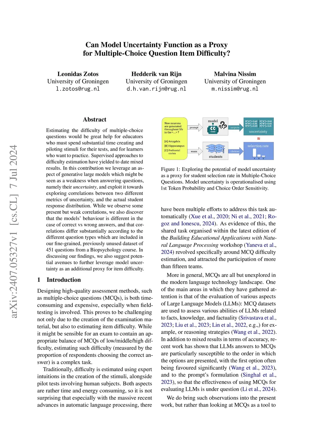 Estimating the difficulty of multiple-choice questions would be great help for educators who must spend substantial time creating and piloting stimuli for their tests, and for learners who want to practice. Supervised approaches to difficulty estimation have yielded to date mixed results. In this contribution we leverage an aspect of generative large models which might be seen as a weakness when answering questions, namely their uncertainty, and exploit it towards exploring correlations between two different metrics of uncertainty, and the actual student response distribution. While we observe some present but weak correlations, we also discover that the models' behaviour is different in the case of correct vs wrong answers, and that correlations differ substantially according to the different question types which are included in our fine-grained, previously unused dataset of 451 questions from a Biopsychology course. In discussing our findings, we also suggest potential avenues to further leverage model uncertainty as an additional proxy for item difficulty.