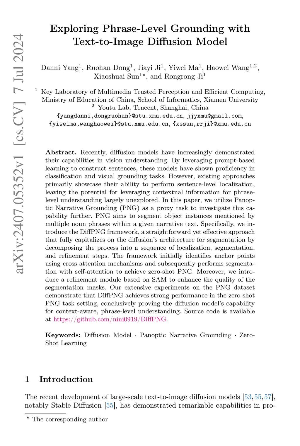 Recently, diffusion models have increasingly demonstrated their capabilities in vision understanding. By leveraging prompt-based learning to construct sentences, these models have shown proficiency in classification and visual grounding tasks. However, existing approaches primarily showcase their ability to perform sentence-level localization, leaving the potential for leveraging contextual information for phrase-level understanding largely unexplored. In this paper, we utilize Panoptic Narrative Grounding (PNG) as a proxy task to investigate this capability further. PNG aims to segment object instances mentioned by multiple noun phrases within a given narrative text. Specifically, we introduce the DiffPNG framework, a straightforward yet effective approach that fully capitalizes on the diffusion's architecture for segmentation by decomposing the process into a sequence of localization, segmentation, and refinement steps. The framework initially identifies anchor points using cross-attention mechanisms and subsequently performs segmentation with self-attention to achieve zero-shot PNG. Moreover, we introduce a refinement module based on SAM to enhance the quality of the segmentation masks. Our extensive experiments on the PNG dataset demonstrate that DiffPNG achieves strong performance in the zero-shot PNG task setting, conclusively proving the diffusion model's capability for context-aware, phrase-level understanding. Source code is available at \url{https://github.com/nini0919/DiffPNG}.