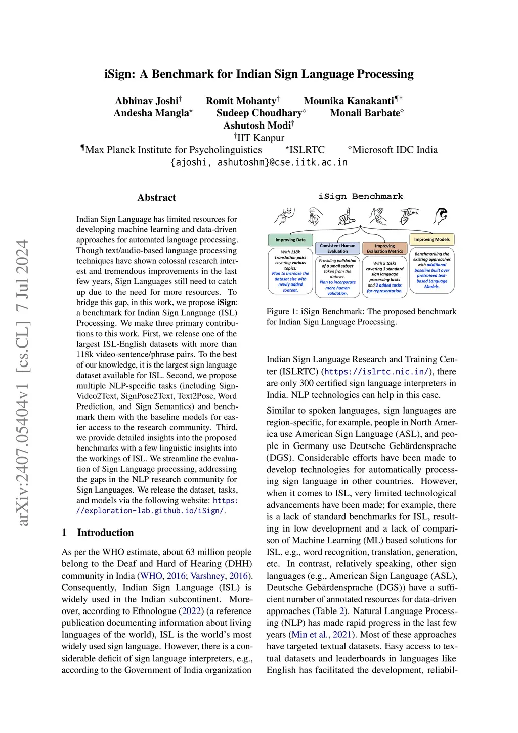 Indian Sign Language has limited resources for developing machine learning and data-driven approaches for automated language processing. Though text/audio-based language processing techniques have shown colossal research interest and tremendous improvements in the last few years, Sign Languages still need to catch up due to the need for more resources. To bridge this gap, in this work, we propose iSign: a benchmark for Indian Sign Language (ISL) Processing. We make three primary contributions to this work. First, we release one of the largest ISL-English datasets with more than 118K video-sentence/phrase pairs. To the best of our knowledge, it is the largest sign language dataset available for ISL. Second, we propose multiple NLP-specific tasks (including SignVideo2Text, SignPose2Text, Text2Pose, Word Prediction, and Sign Semantics) and benchmark them with the baseline models for easier access to the research community. Third, we provide detailed insights into the proposed benchmarks with a few linguistic insights into the workings of ISL. We streamline the evaluation of Sign Language processing, addressing the gaps in the NLP research community for Sign Languages. We release the dataset, tasks, and models via the following website: https://exploration-lab.github.io/iSign/