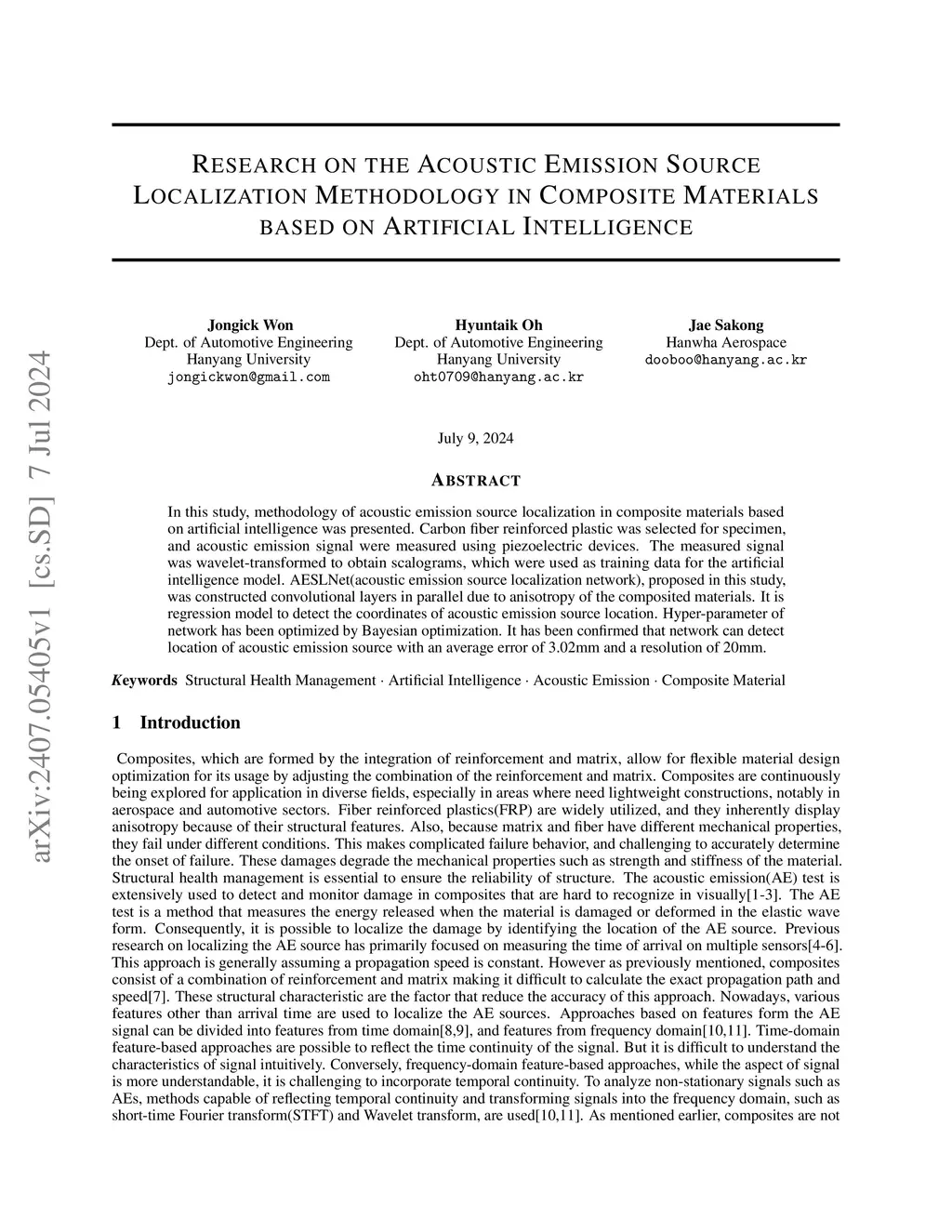 In this study, methodology of acoustic emission source localization in composite materials based on artificial intelligence was presented. Carbon fiber reinforced plastic was selected for specimen, and acoustic emission signal were measured using piezoelectric devices. The measured signal was wavelet-transformed to obtain scalograms, which were used as training data for the artificial intelligence model. AESLNet(acoustic emission source localization network), proposed in this study, was constructed convolutional layers in parallel due to anisotropy of the composited materials. It is regression model to detect the coordinates of acoustic emission source location. Hyper-parameter of network has been optimized by Bayesian optimization. It has been confirmed that network can detect location of acoustic emission source with an average error of 3.02mm and a resolution of 20mm.