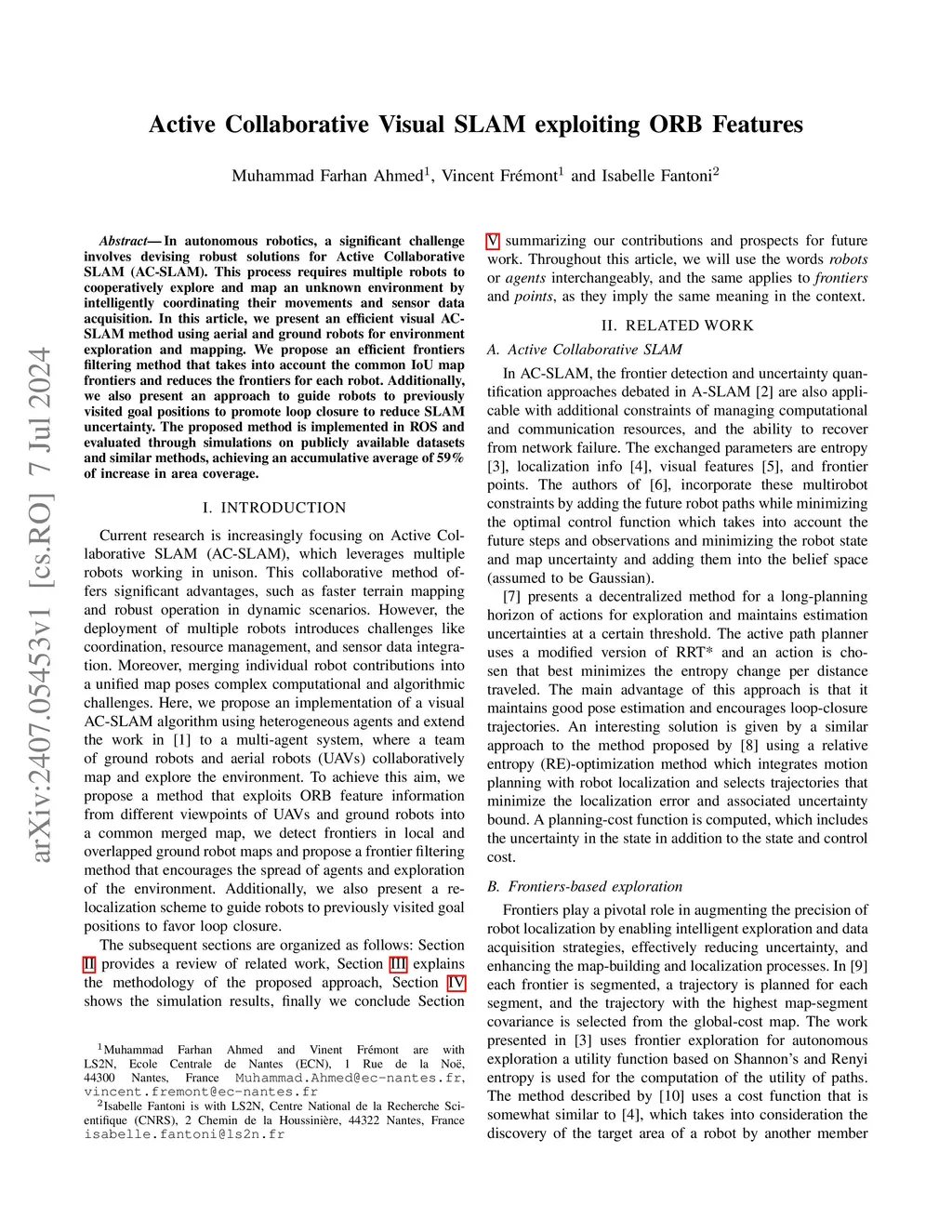 In autonomous robotics, a significant challenge involves devising robust solutions for Active Collaborative SLAM (AC-SLAM). This process requires multiple robots to cooperatively explore and map an unknown environment by intelligently coordinating their movements and sensor data acquisition. In this article, we present an efficient visual AC-SLAM method using aerial and ground robots for environment exploration and mapping. We propose an efficient frontiers filtering method that takes into account the common IoU map frontiers and reduces the frontiers for each robot. Additionally, we also present an approach to guide robots to previously visited goal positions to promote loop closure to reduce SLAM uncertainty. The proposed method is implemented in ROS and evaluated through simulations on publicly available datasets and similar methods, achieving an accumulative average of 59% of increase in area coverage.