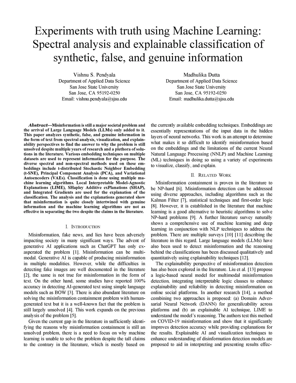 Misinformation is still a major societal problem and the arrival of Large Language Models (LLMs) only added to it. This paper analyzes synthetic, false, and genuine information in the form of text from spectral analysis, visualization, and explainability perspectives to find the answer to why the problem is still unsolved despite multiple years of research and a plethora of solutions in the literature. Various embedding techniques on multiple datasets are used to represent information for the purpose. The diverse spectral and non-spectral methods used on these embeddings include t-distributed Stochastic Neighbor Embedding (t-SNE), Principal Component Analysis (PCA), and Variational Autoencoders (VAEs). Classification is done using multiple machine learning algorithms. Local Interpretable Model-Agnostic Explanations (LIME), SHapley Additive exPlanations (SHAP), and Integrated Gradients are used for the explanation of the classification. The analysis and the explanations generated show that misinformation is quite closely intertwined with genuine information and the machine learning algorithms are not as effective in separating the two despite the claims in the literature.