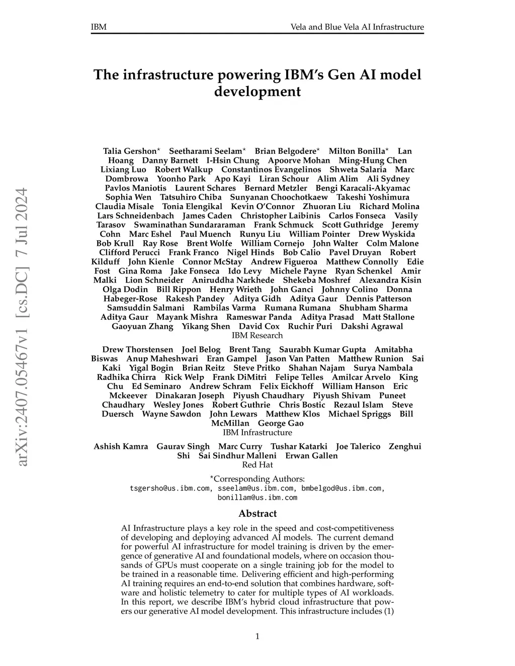 AI Infrastructure plays a key role in the speed and cost-competitiveness of developing and deploying advanced AI models. The current demand for powerful AI infrastructure for model training is driven by the emergence of generative AI and foundational models, where on occasion thousands of GPUs must cooperate on a single training job for the model to be trained in a reasonable time. Delivering efficient and high-performing AI training requires an end-to-end solution that combines hardware, software and holistic telemetry to cater for multiple types of AI workloads. In this report, we describe IBM's hybrid cloud infrastructure that powers our generative AI model development. This infrastructure includes (1) Vela: an AI-optimized supercomputing capability directly integrated into the IBM Cloud, delivering scalable, dynamic, multi-tenant and geographically distributed infrastructure for large-scale model training and other AI workflow steps and (2) Blue Vela: a large-scale, purpose-built, on-premises hosting environment that is optimized to support our largest and most ambitious AI model training tasks. Vela provides IBM with the dual benefit of high performance for internal use along with the flexibility to adapt to an evolving commercial landscape. Blue Vela provides us with the benefits of rapid development of our largest and most ambitious models, as well as future-proofing against the evolving model landscape in the industry. Taken together, they provide IBM with the ability to rapidly innovate in the development of both AI models and commercial offerings.