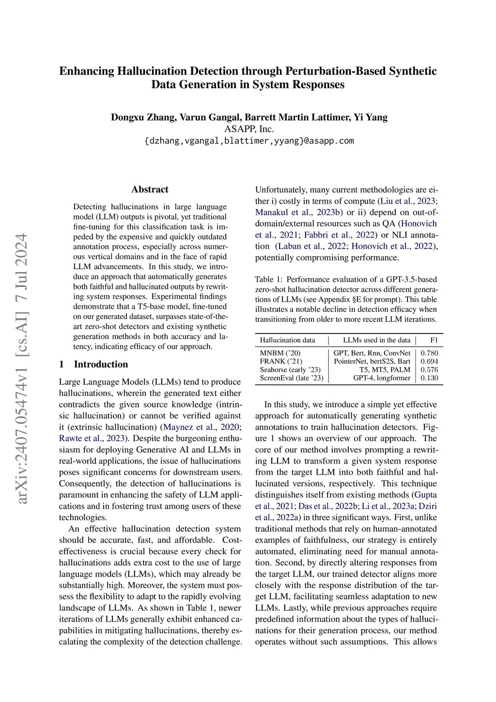 Detecting hallucinations in large language model (LLM) outputs is pivotal, yet traditional fine-tuning for this classification task is impeded by the expensive and quickly outdated annotation process, especially across numerous vertical domains and in the face of rapid LLM advancements. In this study, we introduce an approach that automatically generates both faithful and hallucinated outputs by rewriting system responses. Experimental findings demonstrate that a T5-base model, fine-tuned on our generated dataset, surpasses state-of-the-art zero-shot detectors and existing synthetic generation methods in both accuracy and latency, indicating efficacy of our approach.