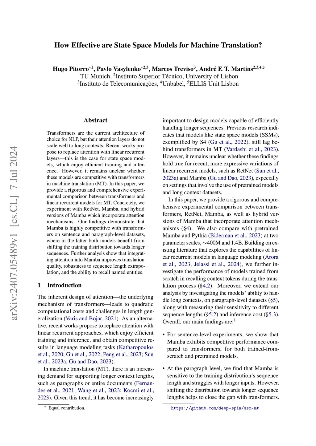 Transformers are the current architecture of choice for NLP, but their attention layers do not scale well to long contexts. Recent works propose to replace attention with linear recurrent layers -- this is the case for state space models, which enjoy efficient training and inference. However, it remains unclear whether these models are competitive with transformers in machine translation (MT). In this paper, we provide a rigorous and comprehensive experimental comparison between transformers and linear recurrent models for MT. Concretely, we experiment with RetNet, Mamba, and hybrid versions of Mamba which incorporate attention mechanisms. Our findings demonstrate that Mamba is highly competitive with transformers on sentence and paragraph-level datasets, where in the latter both models benefit from shifting the training distribution towards longer sequences. Further analysis show that integrating attention into Mamba improves translation quality, robustness to sequence length extrapolation, and the ability to recall named entities.