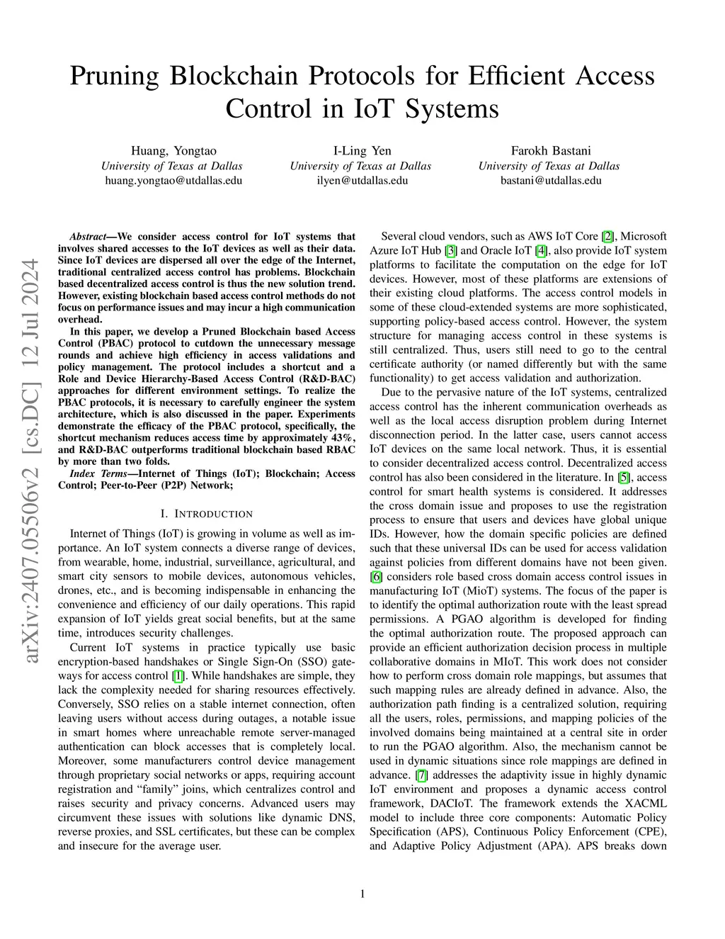 We consider access control for IoT systems that involves shared accesses to the IoT devices as well as their data. Since IoT devices are dispersed all over the edge of the Internet, traditional centralized access control has problems. Blockchain based decentralized access control is thus the new solution trend. However, existing blockchain based access control methods do not focus on performance issues and may incur a high communication overhead. In this paper, we develop a Pruned Blockchain based Access Control (PBAC) protocol to cutdown the unnecessary message rounds and achieve high efficiency in access validations and policy management. The protocol includes a shortcut and a Role and Device Hierarchy-Based Access Control (R&D-BAC) approaches for different environment settings. To realize the PBAC protocol, it is necessary to carefully engineer the system architecture, which is also discussed in the paper. Experiments demonstrate the efficacy of the PBAC protocol, specifically, the shortcut mechanism reduces access time by approximately 43%, and R&D-BAC outperforms traditional blockchain based RBAC by more than two folds.